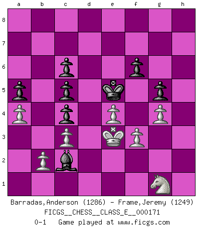 Last move : 0-1 2014 February 3 13:32:47 [Event "FICGS__CHESS__CLASS_E__000171"] [Site "FICGS"] [Date "2014.01.31"] [Round "1"] [White "Barradas,Anderson"] [Black "Frame,Jeremy"] [Result "0-1"] [WhiteElo "1286"] [BlackElo "1249"] 1.e4 e5 2.Nf3 Nc6 3.d4 exd4 4.Nxd4 Bc5 5.Be3 d6 6.Nxc6 bxc6 7.Bxc5 dxc5 8.Qxd8+ Kxd8 9.Nc3 Be6 10.O-O-O Ke7 11.h3 Nf6 12.f3 Rhd8 13.Be2 Nh5 14.Rxd8 Rxd8 15.Bd3 c4 16.Be2 Ng3 17.Rd1 Nxe2+ 18.Nxe2 Rxd1+ 19.Kxd1 c5 20.c3 f6 21.h4 h6 22.Kc2 g5 23.hxg5 hxg5 24.g3 Bh3 25.g4 Ke6 26.Ng1 Bf1 27.Kd2 Ke5 28.Ke3 c6 29.Kf2 Bd3 30.Ke3 a5 31.a4 Bc2 0-1 Scotch game Queenside Castling by player White (move 10) Player Black won this chess game. Follow this game move after move (download)You can only get good at Chess if you love the game. (Bobby Fischer) Als ich elf wurde, wurde ich einfach gut. (Robert James Fischer) El Ajedrez lo es todo: arte, ciencia y deporte. (Anatoly Karpov) Comme les marins qui ont mille raisons différentes d'aller en mer, les joueurs d'échecs en ont tout autant avant de s'installer devant une table et jouer... (Vincent Bertignac, philosophe) If we don't succeed, we run the risk of failure. (George W. Bush)