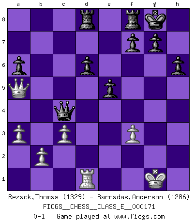 Last move : 0-1 2014 April 1 12:56:0 [Event "FICGS__CHESS__CLASS_E__000171"] [Site "FICGS"] [Date "2014.01.31"] [Round "1"] [White "Rezack,Thomas"] [Black "Barradas,Anderson"] [Result "0-1"] [WhiteElo "1329"] [BlackElo "1286"] 1.e4 c5 2.Nf3 d6 3.d4 cxd4 4.Nxd4 a6 5.Be2 e5 6.Nf3 Nf6 7.Bg5 Be7 8.Nc3 Be6 9.O-O h6 10.Bh4 Bg4 11.h3 Bh5 12.Qd3 Bg6 13.Rad1 O-O 14.Nd5 Nc6 15.Nxe7+ Qxe7 16.Bxf6 Qxf6 17.a3 Rad8 18.Nd2 Nd4 19.f3 Ne6 20.Nc4 Nf4 21.Qe3 Qg5 22.Rf2 b5 23.Qd2 Nxh3+ 24.Kf1 Nxf2 25.Kxf2 bxc4 26.Bxc4 Qf6 27.Qa5 Bxe4 28.c3 Qh4+ 29.Kg1 Bxf3 30.gxf3 Qxc4 0-1 Sicilian Kingside Castling by player White (move 9) Kingside Castling by player Black (move 13) Player Black won this chess game. Follow this game move after move (download)I had a toothache during the first game. In the second game I had a headache. In the third game it was an attack of rheumatism. In the fourth game, I wasn't feeling well. And in the fifth game? Well, must one have to win every game ? (Siegbert Tarrasch) Über Karpov: Er war und ist ein Vertreter der russischen Reaktionäre. Das steckt tief in seiner Seele, wehalb ich nicht nett mit ihm umgehen kann. (Viktor Kortschnoi) Por tratar de evitar la pérdida de una pieza, muchas personas han perdido una partida de Ajedrez. (Savielly Tartakover) C'est une question de caractère, Beaucoup de gens perdent leur motivation très vite. D'autres, ils sont rares, peuvent la conserver très longtemps. J'aime les échecs, encore aujourd'hui je suis heureux d'analyser des parties. J'aime toujours gagner, je déteste encore perdre. Bien jouer est important pour mon intégrité intellectuelle et morale. Et puis les échecs vivent en ce moment une période historique grâce à Internet. Ils se développent dans les systèmes éducatifs à travers le monde. Ils sortent de leur ghetto, et c'est mon rôle de mener à bien cette révolution. (Gary Kasparov) You can't play chess if you're groggy from pills. (Anatoly Karpov)