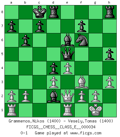 Last move : 0-1 2007 July 13 4:45:38 [Event "FICGS__CHESS__CLASS_E__000034"] [Site "FICGS"] [Date "2007.02.12"] [Round "1"] [White "Grammenos,Nikos"] [Black "Vesely,Tomas"] [Result "0-1"] [WhiteElo "1400"] [BlackElo "1400"] 1.e4 e5 2.Nf3 d5 3.d3 Nc6 4.Be2 d4 5.O-O h6 6.Bd2 Nf6 7.h3 g5 8.c3 g4 9.cxd4 gxf3 10.Bxf3 Qxd4 11.Bc3 Qc5 12.Nd2 h5 13.Nb3 Qd6 14.Qc2 Bh6 15.Nd2 Be6 16.Nb3 b6 17.Qd1 Bg5 18.Qe2 O-O-O 19.Rfd1 Nd4 20.Bxd4 exd4 21.Re1 Qe5 22.Nd2 Bxd2 0-1 QP counter-gambit (elephant gambit) Kingside Castling by player White (move 5) Queenside Castling by player Black (move 18) Player Black won this chess game. Follow this game move after move (download)Chess, like love, like music, has the power to make people happy. (Siegbert Tarrasch) Offener Brief an US-Präsident Bush anlässlich der Verhaftung Bobby Fishers: Verhaften Sie mich. Stecken Sie mich in dieselbe Zelle wie Bobby Fisher und geben Sie uns ein Schachspiel mit. (Boris Vassilievich Spassky) Yo adoro todas la posiciones. Denme una partida posicional difícil, y la jugaré. Pero posiciones totalmente ganadas, no las tolero. (Hein Donner) Karpov est une pièce de musée. (Garry Kasparov) The large trees attract high winds. (Chinese proverb)