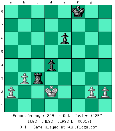 Last move : 0-1 2014 March 10 12:27:13 [Event "FICGS__CHESS__CLASS_E__000171"] [Site "FICGS"] [Date "2014.01.31"] [Round "1"] [White "Frame,Jeremy"] [Black "Goti,Javier"] [Result "0-1"] [WhiteElo "1249"] [BlackElo "1257"] 1.e4 c5 2.Nf3 Nc6 3.d4 cxd4 4.Nxd4 Nf6 5.Nc3 a6 6.Bc4 e6 7.O-O Bc5 8.Be3 Nxd4 9.Bxd4 Bxd4 10.Qxd4 O-O 11.f4 b5 12.Bd3 Bb7 13.Rf3 d5 14.e5 Nd7 15.Rh3 h6 16.Rf1 Rc8 17.Qe3 f6 18.Qg3 fxe5 19.Rxh6 exf4 20.Rxf4 Rxf4 21.Bh7+ Kh8 22.Qxf4 gxh6 23.Qxh6 Qf6 24.Bg6 Kg8 25.Qh7+ Kf8 26.Qxd7 Qxg6 27.Qxb7 Rc4 28.Qxa6 Qxc2 29.Qxb5 Qc1+ 30.Kf2 Rf4+ 31.Ke2 Qc2+ 32.Ke1 Qf2+ 33.Kd1 Rd4+ 34.Kc1 Qd2+ 35.Kb1 Qd3+ 36.Qxd3 Rxd3 37.Kc2 Re3 38.Kd2 d4 39.b3 Rxc3 0-1 Sicilian defense Kingside Castling by player White (move 7) Kingside Castling by player Black (move 10) 10 pieces endgame at move 36 : White KNPPPP , Black KRPP WHITE : King + 1 Knight 4 Pawns BLACK : King + 1 Rook 2 Pawns 9 pieces endgame at move 39 : White KPPPP , Black KRPP WHITE : King + 4 Pawns BLACK : King + 1 Rook 2 Pawns Player Black won this chess game. Follow this game move after move (download)The passion for playing Chess is one of the most unaccountable in the world. (H.G. Wells) Dieses schreckliche Gefühl, dass ich gegen eine Maschine spielte, die niemals Fehler macht, zerschmetterte meinen Widerstand. (Mark Taimanov) Fischer era un maestro de claridad y un Rey del posicionamiento astuto. Sus oponentes podían ver hacia donde se dirigía pero eran impotentes para detenerlo. (Bruce Pandolfini) Le thème de l'attaque double intervient d'une manière ou d'une autre dans l'immense majorité des combinaisons. (Youri Averbakh) When it is a question of money, everybody is of the same religion. (Voltaire)