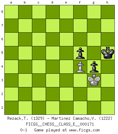 Last move : 0-1 2014 June 3 13:12:41 [Event "FICGS__CHESS__CLASS_E__000171"] [Site "FICGS"] [Date "2014.01.31"] [Round "1"] [White "Rezack,Thomas"] [Black "Martinez Camacho,Victor Hugo"] [Result "0-1"] [WhiteElo "1329"] [BlackElo "1222"] 1.e4 c6 2.d4 d5 3.e5 Bf5 4.f4 e6 5.Nf3 c5 6.c3 Nc6 7.Bb5 Qb6 8.Bxc6+ Qxc6 9.Be3 cxd4 10.Nxd4 Qd7 11.Nxf5 exf5 12.Nd2 Ne7 13.Nf3 b6 14.O-O Ng6 15.Nd4 Bc5 16.Qd3 Ne7 17.b4 Bxd4 18.Bxd4 O-O 19.a4 Nc6 20.b5 Nxd4 21.cxd4 g6 22.Rac1 Rfc8 23.Rxc8+ Rxc8 24.Qa3 Rc4 25.Rd1 Qc7 26.Kf1 Rc2 27.h4 Qc4+ 28.Kg1 Qe2 29.Qf3 Qxf3 30.gxf3 Rc4 31.Kf2 Rxa4 32.Rc1 Rxd4 33.Ke3 Rb4 34.Rc8+ Kg7 35.Rc7 Rxb5 36.Rxa7 Rb3+ 37.Ke2 b5 38.Rd7 Rb2+ 39.Ke3 b4 40.Rxd5 b3 41.Rb5 Rb1 42.Kd2 Rh1 43.Rxb3 Rxh4 44.Ke3 Rh1 45.Rb7 Ra1 46.e6 Ra3+ 47.Kf2 Ra8 48.Rxf7+ Kh6 49.Rd7 Re8 50.e7 Kg7 51.Kg3 Kf7 52.Kh4 h6 53.Kg3 Rxe7 54.Rxe7+ Kxe7 55.Kh4 Kf6 56.Kg3 g5 57.fxg5+ hxg5 58.f4 g4 59.Kh4 Kg6 60.Kg3 Kh5 0-1 Caro-Kann : Advance variation Kingside Castling by player White (move 14) Kingside Castling by player Black (move 18) 10 pieces endgame at move 48 : White KRPPP , Black KRPPP WHITE : King + 1 Rook 3 Pawns BLACK : King + 1 Rook 3 Pawns 9 pieces endgame at move 53 : White KRPP , Black KRPPP WHITE : King + 1 Rook 2 Pawns BLACK : King + 1 Rook 3 Pawns 8 pieces endgame at move 54 : White KRPP , Black KPPP WHITE : King + 1 Rook 2 Pawns BLACK : King + 3 Pawns 7 pieces endgame at move 54 : White KPP , Black KPPP WHITE : King + 2 Pawns BLACK : King + 3 Pawns 6 pieces endgame at move 57 : White KPP , Black KPP WHITE : King + 2 Pawns BLACK : King + 2 Pawns 5 pieces endgame at move 57 : White KP , Black KPP WHITE : King + 1 Pawn BLACK : King + 2 Pawns Player Black won this chess game. Follow this game move after move (download)It's just you and your opponent at the board and you're trying to prove something. (Bobby Fischer) Ich glaube nicht an Psychologie, ich glaube an gute Züge. (Robert James Fischer) Bobby es la celebridad menos entendida y malinterpretada que camina el la faz de esta tierra. (Yasser Seirawan) La solitude du joueur d'Echecs à l'approche du mat est semblable à celle du condamné. (Francis Szpiner) Whatever you do, don't be bored. This is absolutely the most exciting time we could have possibly hoped to be alive. And things are just starting. (From movie Waking life)