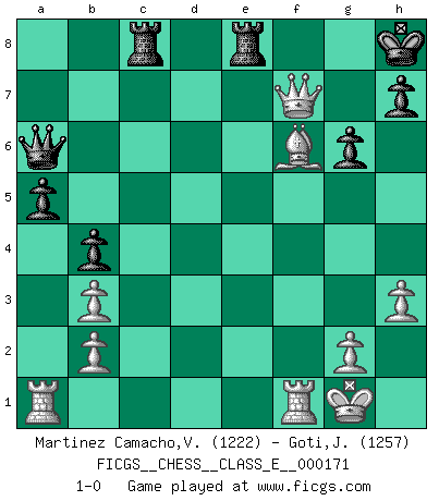 Last move : 1-0 2014 March 6 20:57:54 [Event "FICGS__CHESS__CLASS_E__000171"] [Site "FICGS"] [Date "2014.01.31"] [Round "1"] [White "Martinez Camacho,Victor Hugo"] [Black "Goti,Javier"] [Result "1-0"] [WhiteElo "1222"] [BlackElo "1257"] 1.e4 c5 2.Nc3 Nc6 3.Bc4 e6 4.Nf3 Be7 5.O-O Nf6 6.d3 O-O 7.Bf4 d5 8.exd5 exd5 9.Bb5 Bg4 10.h3 Bxf3 11.Qxf3 Nd4 12.Qd1 a6 13.Ba4 b5 14.Bb3 c4 15.dxc4 dxc4 16.Be3 Nxb3 17.axb3 cxb3 18.cxb3 Re8 19.Qc2 b4 20.Ne2 Rc8 21.Qd1 a5 22.Bd4 g6 23.Ng3 Bd6 24.Qf3 Bxg3 25.Bxf6 Bxf2+ 26.Qxf2 Qd6 27.Bh4 Qa6 28.Qxf7+ Kh8 29.Bf6+ 1-0 Sicilian : Closed, 2...Nc6 Kingside Castling by player White (move 5) Kingside Castling by player Black (move 6) Player White won this chess game. Follow this game move after move (download)Nonsense was the last thing Fischer was interested in, as far as Chess was concerned. (Elie Agur) Dein Körper muss in Topform sein. Dein Schach verfällt, wenn dein Körper verfällt. Der Körper kann nicht vom Geist getrennt werden. (Robert James Fischer) Un juego de Ajedrez es un dialogo, una conversación entre un jugador y su oponente. Cada movimiento del oponente puede contener amenazas o tropiezos, pero un jugador no se puede defender de las amenazas o tomar ventaja de los tropiezos si es que no se pregunta a sí mismo: ¿Que es lo que mi oponente va a hacer después de cada movida?. (Bruce A. Moon) C'est la seule position que je connaisse où les deux camps sont mals. Propos prêtés à V. Anand. 'preceded by its own quotation yields a falsehood' preceded by its own quotation yields a falsehood. (W. V. O. Quine - Set Theory And Its Logic, 1953)
