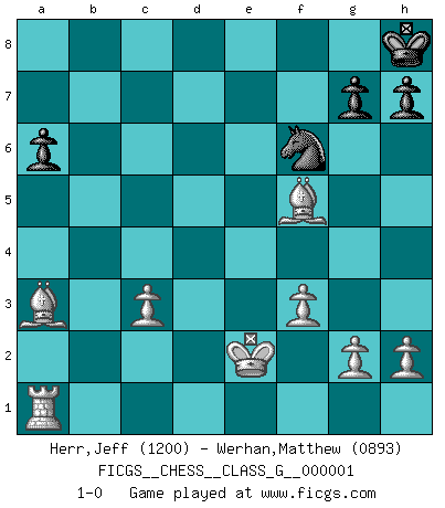 Last move : 1-0 2006 September 28 2:43:54 [Event "FICGS__CHESS__CLASS_G__000001"] [Site "FICGS"] [Date "2006.05.25"] [Round "1"] [White "Herr,Jeff"] [Black "Werhan,Matthew"] [Result "1-0"] [WhiteElo "1200"] [BlackElo "0893"] 1.d4 Nf6 2.c4 e6 3.Nc3 Bb4 4.Qc2 c5 5.a3 Bxc3+ 6.bxc3 Nc6 7.e3 Qa5 8.Bd2 b6 9.Nf3 Bb7 10.Be2 Ne7 11.O-O O-O 12.Ne5 d6 13.Nd3 Rac8 14.f3 Nd7 15.e4 a6 16.Rfb1 f5 17.Nc1 Bc6 18.a4 Ng6 19.Bd1 fxe4 20.Nb3 Qxa4 21.Rxa4 Bxa4 22.Qxe4 Rce8 23.dxc5 bxc5 24.Ra1 Nb6 25.Na5 d5 26.cxd5 exd5 27.Qd3 c4 28.Qd4 Rb8 29.Bxa4 Ne7 30.Bc2 Nd7 31.Qh4 Nf6 32.Bc1 Ng6 33.Bxg6 Rb6 34.Qd4 Re6 35.Ba3 Rd8 36.Bf5 Re2 37.Kf1 Rde8 38.Nxc4 dxc4 39.Qxc4+ Kh8 40.Qxe2 Rxe2 41.Kxe2 1-0 Nimzo-Indian : Classical, 4...c5 Kingside Castling by player White (move 11) Kingside Castling by player Black (move 11) Player White won this chess game. Follow this game move after move (download)Chess makes man wiser and clear-sighted. (Vladimir Putin) Rauchen ist dem Schachspieler bei seiner Arbeit, also im Wettkampf, untersagt. (Viktor Kortschnoi) No todos los artistas son jugadores de Ajedrez, pero todos los jugadores de Ajedrez son artistas. (Marcel Duchamp) Un millionnaire : 'Monsieur Steinitz ! Vous ne participez aux tournois que pour l'argent, alors que moi je n'y viens que pour l'honneur.' Steinitz : 'Chacun joue pour ce qu'il n'a pas'... I've never seen so many men wasted so badly. (Blondie in The Good, The Bad and The Ugly)