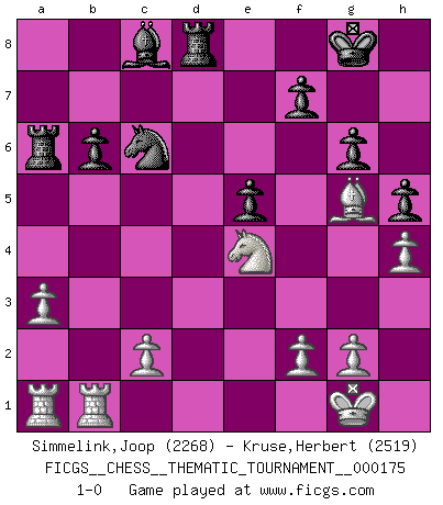 Last move : 1-0 2014 February 12 12:20:30 [Event "FICGS__CHESS__THEMATIC_TOURNAMENT__000175"] [Site "FICGS"] [Date "2014.02.03"] [Round "1"] [White "Simmelink,Joop"] [Black "Kruse,Herbert"] [Result "1-0"] [WhiteElo "2268"] [BlackElo "2519"] 1.e4 e6 2.d4 d5 3.Nc3 Nf6 4.Bg5 Bb4 5.e5 h6 6.Be3 Ne4 7.Qg4 g6 8.a3 Bxc3+ 9.bxc3 Nxc3 10.Bd3 b6 11.h4 c5 12.dxc5 Nc6 13.Bd2 h5 14.Qf4 Ne4 15.Bxe4 dxe4 16.Ne2 O-O 17.Nc3 Qd4 18.O-O Qxe5 19.cxb6 axb6 20.Rfb1 Ra6 21.Nxe4 Qxf4 22.Bxf4 e5 23.Bh6 Rd8 24.Bg5 1-0 French : MacCutcheon, Janowski variation Kingside Castling by player Black (move 16) Kingside Castling by player White (move 18) Player White won this chess game. Follow this game move after move (download)Botvinnik tried to take the mystery out of Chess, always relating it to situations in ordinary life. He used to call Chess a typical inexact problem similar to those which people are always having to solve in everyday life. (Garry Kasparov) Eine Person mit durchschnittlichem IQ kann etwa eine ELO von 2000 erreichen. (Jonathan Levitt) Siempre es mejor sacrificar los hombres de tu oponente. (Savielly Tartakower) Les échecs sont un jeu par leur forme, un art par leur essence et une science par sa difficulté d'acquisition. Ils peuvent vous procurer autant de plaisir qu'un bon livre ou une belle musique, mais vous n'aurez une réelle joie que si vous arrivez à bien jouer. (Tigran Petrosian) A woman without a man is like a fish without a bicycle. (Gloria Steinem)