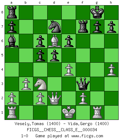 Last move : 1-0 2007 July 3 15:42:38 [Event "FICGS__CHESS__CLASS_E__000034"] [Site "FICGS"] [Date "2007.02.12"] [Round "1"] [White "Vesely,Tomas"] [Black "Vida,Gergo"] [Result "1-0"] [WhiteElo "1400"] [BlackElo "1400"] 1.e4 c5 2.Bc4 Nf6 3.d3 e6 4.Nf3 d5 5.Bb5+ Nc6 6.e5 Nd7 7.Bxc6 bxc6 8.b3 Qc7 9.Bf4 Be7 10.h4 Qa5+ 11.Bd2 Qb6 12.Bg5 f6 13.Bf4 O-O 14.g4 Qb4+ 15.Qd2 fxe5 16.Bg5 Qxg4 17.Rg1 Qxf3 18.Bxe7 Rf7 19.Bd6 e4 20.Nc3 Ba6 21.dxe4 1-0 This chess game has been lost on time (started : 2007.02.12 16:49:58) Sicilian defense Kingside Castling by player Black (move 13) Player White won this chess game. Follow this game move after move (download)There is only one thing Fischer does in Chess without pleasure: to lose ! (Boris Spassky) Ich habe Putins Aufstieg an die Macht beobachtet und seine Politik, die demokratischen Institutionen meines Landes zu zerstören. (Garry Kasparov) Juega la Apertura como un libro, el Juego Medio como un mago y los Finales como una máquina. (Spielmann) Les Echecs ont trois composantes : le temps, l'espace et le matériel en dernier. (Mikhail Tal) Even the best needles are not sharp at both ends. (Chinese proverb)