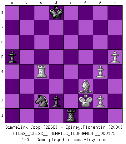 Last move : 1-0 2014 March 21 17:49:13 [Event "FICGS__CHESS__THEMATIC_TOURNAMENT__000175"] [Site "FICGS"] [Date "2014.02.03"] [Round "1"] [White "Simmelink,Joop"] [Black "Epiney,Florentin"] [Result "1-0"] [WhiteElo "2268"] [BlackElo "2000"] 1.e4 e6 2.d4 d5 3.Nc3 Nf6 4.Bg5 Bb4 5.e5 h6 6.Be3 Ne4 7.Qg4 g6 8.a3 Bxc3+ 9.bxc3 c5 10.Bd3 h5 11.Qf4 g5 12.Qf3 Nxc3 13.dxc5 Nc6 14.Qg3 Qa5 15.Bd2 Qxc5 16.Nf3 g4 17.Ng5 d4 18.O-O Qxe5 19.Rae1 Qxg3 20.fxg3 Rg8 21.Nxf7 Nd5 22.Rf2 Rb8 23.Bh6 Kd7 24.Ng5 e5 25.Rf7+ Kd8 26.Be4 Nc3 27.Bh7 Re8 28.Bg6 Rg8 29.Bxh5 b5 30.Ref1 b4 31.R1f6 Ne7 32.Bf8 Rb7 33.Ne6+ Bxe6 34.Rxe6 Ncd5 35.Bxe7+ Nxe7 36.axb4 Rd7 37.Rxe5 Nc6 38.Re4 Rxf7 39.Bxf7 Rg5 40.Be6 Nxb4 41.Bxg4 Nxc2 42.h4 Rg8 43.h5 a5 44.Bd1 d3 45.g4 Re8 46.Bf3 d2 47.Rc4 Re1+ 48.Kf2 1-0 French : MacCutcheon, Janowski variation Kingside Castling by player White (move 18) Player White won this chess game. Follow this game move after move (download)Could we look into the head of a Chess player, we should see there a whole world of feelings, images, ideas, emotion and passion. (Alfred Binet) Der zweitbeste Zug ist oft der einzig richtige. (Savielly Grigorievitsch Tartakower) Una compensación adecuada por un sacrificio es tener una combinación sólida que conduce a una posición ganadora; una compensación adecuada por una metida de pata es dejar a tu oponente arrebatar una derrota de las fauces de la victoria. (Bruce A. Moon) Si rien de grave n'est détecté lors de l'analyse d'une position, on joue alors le coup. Seconde règle de Blumenfeld. Is not life a hundred times too short to bore ourselves ? (Friedrich Nietzsche)