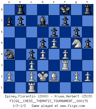 Last move : 1/2-1/2 2014 February 13 21:19:30 [Event "FICGS__CHESS__THEMATIC_TOURNAMENT__000175"] [Site "FICGS"] [Date "2014.02.03"] [Round "1"] [White "Epiney,Florentin"] [Black "Kruse,Herbert"] [Result "1/2-1/2"] [WhiteElo "2000"] [BlackElo "2519"] 1.e4 e6 2.d4 d5 3.Nc3 Nf6 4.Bg5 Bb4 5.e5 h6 6.Bd2 Bxc3 7.bxc3 Ne4 8.Qg4 Kf8 9.Qf4 c5 10.Bd3 Nxd2 11.Qxd2 Nd7 12.f4 Qa5 13.Nf3 c4 14.Be2 Nb6 15.Qe3 Qa3 16.Kd2 Bd7 17.Rhf1 h5 18.Ng5 Re8 19.Rf3 Na4 20.Qg1 Rb8 21.Qc1 Qxc1+ 22.Rxc1 g6 1/2-1/2 French : MacCutcheon, Lasker variation This chess game ended in a draw. Follow this game move after move (download)Though most people love to look at the games of the great attacking masters, some of the most successful players in history have been the quiet positional players. They slowly grind you down by taking away your space, tying up your pieces, and leaving you with virtually nothing to do ! (Yasser Seirawan) Wenn du nicht weißt was du tun sollst, warte bis dein Gegner eine Idee hat. Sie wird sicher schlecht sein. (Siegbert Tarrasch) En la vida, como en el Ajedrez, los Peones propios obstruyen nuestro camino. La gran fortuna de un hombre, su comodidad, placer, hijos, libros, que deberían ayudarle a ganar, con mucha frecuencia lo ponen en Jaque Mate. (Charles Buxton) Même si vous avez un bon coup à faire, regardez toujours s'il n'y en a pas un qui lui soit préférable. (Pedro Damiano) Somehow our devils are never quite what we expect when we meet them face to face. (Nelson DeMille)