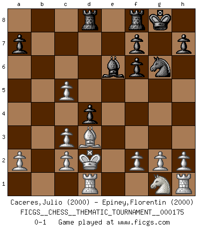 Last move : 0-1 2014 June 1 22:14:14 [Event "FICGS__CHESS__THEMATIC_TOURNAMENT__000175"] [Site "FICGS"] [Date "2014.02.03"] [Round "1"] [White "Caceres,Julio"] [Black "Epiney,Florentin"] [Result "0-1"] [WhiteElo "2000"] [BlackElo "2000"] 1.e4 e6 2.d4 d5 3.Nc3 Nf6 4.Bg5 Bb4 5.exd5 exd5 6.Qe2+ Be6 7.Qb5+ Nc6 8.Bxf6 Bxc3+ 9.bxc3 gxf6 10.Qxb7 Bd7 11.O-O-O O-O 12.Qb5 Ne7 13.Qc5 c6 14.Bd3 Ng6 15.Qd6 Be6 16.Qxd8 Raxd8 17.Kd2 c5 18.dxc5 d4 0-1 This chess game has been lost on time (started : 2014.02.03 0:43:26) French : MacCutcheon variation Queenside Castling by player White (move 11) Kingside Castling by player Black (move 11) Player Black won this chess game. Follow this game move after move (download)When I have White, I win because I am white; When I have Black, I win because I am Bogolyubov. (Bogolyubov) Der Traum, für den ich lebe, ist der von einem freien Russland. Viele mögen sagen: Russland hat doch ein Parlament, einen gewählten Präsidenten. Aber ich spüre, dass in meiner Heimat die Angst wiederkehrt. Eine Angst, sich frei zu äußern, bestimmte Dinge zu tun (Garry Kasparov) Sin errores no puede haber brillantez. (Emanuel Lasker) C'est la seule position que je connaisse où les deux camps sont mals. Propos prêtés à V. Anand. Think like a man of action, act like a man of thought. (Henri Louis Bergson)