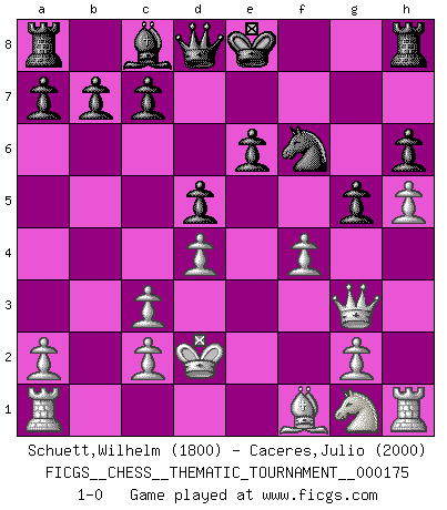 Last move : 1-0 2014 July 2 0:8:48 [Event "FICGS__CHESS__THEMATIC_TOURNAMENT__000175"] [Site "FICGS"] [Date "2014.02.03"] [Round "1"] [White "Schuett,Wilhelm"] [Black "Caceres,Julio"] [Result "1-0"] [WhiteElo "1800"] [BlackElo "2000"] 1.e4 e6 2.d4 d5 3.Nc3 Nf6 4.Bg5 Bb4 5.e5 h6 6.Bd2 Bxc3 7.bxc3 Ne4 8.Qg4 g6 9.h4 Nxd2 10.Kxd2 Nd7 11.h5 g5 12.f4 f5 13.exf6 Nxf6 14.Qg3 1-0 This chess game has been lost on time (started : 2014.02.03 0:43:26) French : MacCutcheon, Lasker variation Player White won this chess game. Follow this game move after move (download)A man without frontiers. He didn't divide the East and the West, he brought them together in their admiration for him. (Ljubomir Ljubojevic, about Bobby Fischer's death) Warum muß ich gegen diesen IDIOTEN verlieren? (Aaron Nimzowitsch) Si tu oponente te ofrece un empate, trata de averiguar porque piensa él que esta en una posición peor. (Nigel Short) Les échecs, c'est la lutte contre l'erreur. (Johannes Zukertort) Live, lose, and learn, by observing your opponent how to win. (Amber Steenbock)