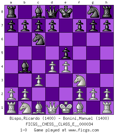 Last move : 1-0 2007 March 26 14:55:2 [Event "FICGS__CHESS__CLASS_E__000034"] [Site "FICGS"] [Date "2007.02.12"] [Round "1"] [White "Bispo,Ricardo"] [Black "Bonini,Manuel"] [Result "1-0"] [WhiteElo "1400"] [BlackElo "1400"] 1.e4 e5 2.Nf3 Nc6 3.d4 Bb4+ 4.c3 1-0 This chess game has been lost on time (started : 2007.02.12 16:49:58) Scotch Opening Player White won this chess game. Follow this game move after move (download)You have to have the fighting spirit. You have to force moves and take chances. (Bobby Fischer) Ein Isolani verdüstert die Stimmung auf dem ganzen Schachbrett. (Savielly Grigorievitsch Tartakower) Cuando veas una buena jugada, trata de encontrar otra mejor. (Emanuel Lasker) Dans le domaine de la peinture, de la gravure et de la sculpture, dès la première décennie de notre siècle, les artistes abandonnent la représentation de la partie d'échecs pour se concentrer sur les pièces, sur les échiquiers et sur toutes les variations auxquelles les unes et les autres peuvent donner lieu. On passe en quelque sorte d'un thème social à un thème musical (au sens de la musica médiévale, c'est-à-dire d'une notion qui inclue le rythme, l'harmonie, la construction et la déconstruction, etc.). Graphiquement et picturalement, l'échiquier apparaît comme une structure ouverte, dynamique, d'une richesse infinie, autorisant toutes les combinatoires et débouchant sur des mouvements et des rythmes de nature exponentielle. (Michel Pastoureau) Man is still the most extraordinary computer of all. (John F. Kennedy)
