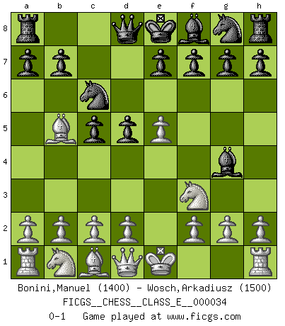 Last move : 0-1 2007 March 25 15:12:49 [Event "FICGS__CHESS__CLASS_E__000034"] [Site "FICGS"] [Date "2007.02.12"] [Round "1"] [White "Bonini,Manuel"] [Black "Wosch,Arkadiusz"] [Result "0-1"] [WhiteElo "1400"] [BlackElo "1500"] 1.e4 c5 2.e5 Nc6 3.Nf3 d5 4.Bb5 Bg4 0-1 This chess game has been lost on time (started : 2007.02.12 16:49:58) Sicilian defense Player Black won this chess game. Follow this game move after move (download)If one piece is badly posted, the whole game is bad. (Tarrasch) Vielleicht wirkt die Aura früherer Spieler glanzvoller als die der heutigen Spieler, aber das liegt daran, dass man kein Programm wie Fritz hatte, das einem all die Löcher in ihren Partien zeigt. (Vladimir Kramnik) Uno por uno, yo los acribillé, mi superioridad muy pronto se volvio aparente. (Jose Capablanca) 'L'échange des dames est un coup dur pour les deux adversaires...' Un journaliste lors d'une partie du match Spassky-Fischer Coffee just isn't my cup of tea. (Unknown)
