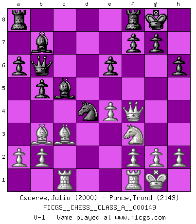 Last move : 0-1 2014 May 31 10:12:42 [Event "FICGS__CHESS__CLASS_A__000149"] [Site "FICGS"] [Date "2014.02.06"] [Round "1"] [White "Caceres,Julio"] [Black "Ponce,Trond"] [Result "0-1"] [WhiteElo "2000"] [BlackElo "2143"] 1.d4 d5 2.c4 e6 3.Nf3 Nf6 4.Nc3 c5 5.cxd5 cxd4 6.Nxd4 Nxd5 7.Bd2 Bc5 8.Nf3 O-O 9.e4 Nxc3 10.Bxc3 Nc6 11.Bc4 a6 12.O-O b5 13.Bb3 Bb7 14.Rc1 Qb6 15.Qd2 h6 16.Qf4 Nd4 0-1 This chess game has been lost on time (started : 2014.02.06 8:12:20) Queen's gambit declined Kingside Castling by player Black (move 8) Kingside Castling by player White (move 12) Player Black won this chess game. Follow this game move after move (download)With or without the title, Bobby Fischer was unquestionably the greatest player of his time. (Burt Hochberg) Ich kenne Menschen, die allen Willen der Welt besitzen und doch nicht Schach spielen können. (Robert James Fischer) Mis oponentes también hacen buenas movidas. A veces yo no tomo esas cosas en consideración. (Bobby Fischer) La guerre est enfant de la passion, la passion est enfant du narcissisme et le narcissisme est l'enfant. (...) Une autre partie ? (Thibault de Vassal) Man with more than one clock never knows what time it is. (Chinese thought)