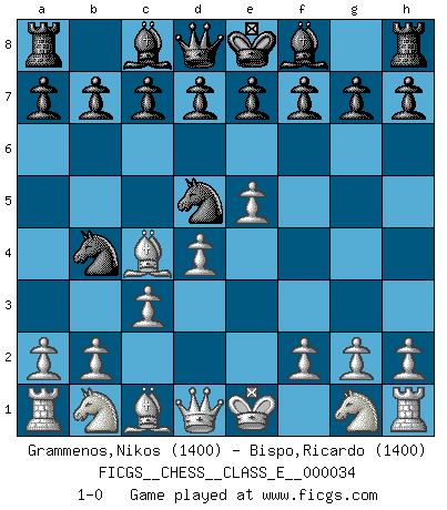 Last move : 1-0 2007 April 1 15:32:19 [Event "FICGS__CHESS__CLASS_E__000034"] [Site "FICGS"] [Date "2007.02.12"] [Round "1"] [White "Grammenos,Nikos"] [Black "Bispo,Ricardo"] [Result "1-0"] [WhiteElo "1400"] [BlackElo "1400"] 1.e4 Nf6 2.e5 Nd5 3.d4 Nc6 4.Bc4 Ncb4 5.c3 1-0 This chess game has been lost on time (started : 2007.02.12 16:49:58) Alekhine's defense Player White won this chess game. Follow this game move after move (download)Live, lose, and learn, by observing your opponent how to win. (Amber Steenbock) Wie ich sie so einen nach dem anderen nieder mähte wurde meine Überlegenheit offensichtlich. (José Raúl Capablanca) La táctica fluye a partir de una posición superior. (Bobby Fischer) Toute estimation doit être constamment réévaluée. (Jacob Estrin) Animated gif is worth one mega-word. (Unknown)