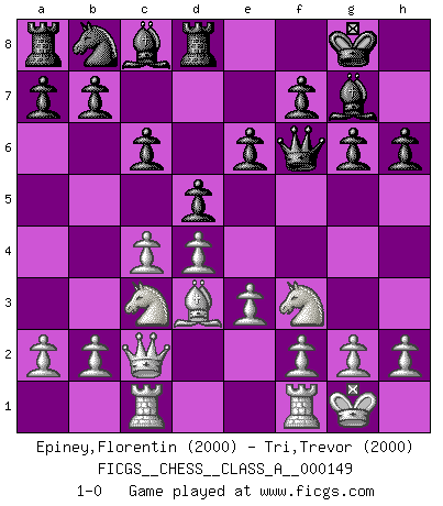 Last move : 1-0 2014 May 9 9:11:30 [Event "FICGS__CHESS__CLASS_A__000149"] [Site "FICGS"] [Date "2014.02.06"] [Round "1"] [White "Epiney,Florentin"] [Black "Tri,Trevor"] [Result "1-0"] [WhiteElo "2000"] [BlackElo "2000"] 1.Nf3 Nf6 2.d4 e6 3.c4 d5 4.Bg5 h6 5.Bxf6 Qxf6 6.Nc3 c6 7.e3 g6 8.Bd3 Bg7 9.Rc1 O-O 10.O-O Rd8 11.Qc2 1-0 This chess game has been lost on time (started : 2014.02.06 8:12:20) Reti Opening Kingside Castling by player Black (move 9) Kingside Castling by player White (move 10) Player White won this chess game. Follow this game move after move (download)Chess problems demand from the composer the same virtues that characterize all worthwhile art: originality, invention, conciseness, harmony, complexity, and splendid insincerity. (Vladimir Nabokov) Ich würde mich als ganz normalen Jungen bezeichnen [Im Alter von 12]. (Sergej Karjakin) De eso se trata el Ajedrez. Un día le das una lección a tu oponente y al día siguiente el te da una a tí. (Bobby Fischer) Les Echecs ont trois composantes : le temps, l'espace et le matériel en dernier. (Mikhail Tal) I've never seen so many men wasted so badly. (Blondie in The Good, The Bad and The Ugly)