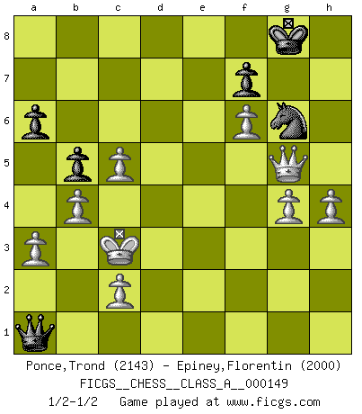 Last move : 1/2-1/2 2014 March 30 16:11:41 [Event "FICGS__CHESS__CLASS_A__000149"] [Site "FICGS"] [Date "2014.02.06"] [Round "1"] [White "Ponce,Trond"] [Black "Epiney,Florentin"] [Result "1/2-1/2"] [WhiteElo "2143"] [BlackElo "2000"] 1.e4 c5 2.Nc3 Nc6 3.Nge2 e6 4.g3 Nf6 5.Bg2 Be7 6.O-O O-O 7.d3 Rb8 8.f4 d5 9.exd5 exd5 10.f5 d4 11.Ne4 Re8 12.Nf4 Ne5 13.Nxf6+ Bxf6 14.Nd5 b6 15.Nxf6+ Qxf6 16.Qh5 Bb7 17.Bxb7 Rxb7 18.Bg5 Qd6 19.f6 g6 20.Qh6 Qf8 21.Qh4 Re6 22.g4 Rb8 23.Bh6 Qd6 24.Rf2 Qd5 25.Raf1 Rbe8 26.Bd2 Qd6 27.b3 b5 28.a3 a6 29.Rf4 Qf8 30.b4 h6 31.R4f2 g5 32.Qh5 c4 33.dxc4 Ng6 34.c5 Re2 35.Qh3 R2e4 36.Qh5 R8e6 37.Rf5 Qa8 38.R1f3 Nh4 39.Rxg5+ hxg5 40.Qxg5+ Ng6 41.Rh3 Re1+ 42.Bxe1 Rxe1+ 43.Kf2 Re2+ 44.Kxe2 Qg2+ 45.Kd3 Qxh3+ 46.Kxd4 Qf3 47.h4 Qd1+ 48.Kc3 Qa1+ 49.Kb3 Qb1+ 50.Kc3 Qa1+ 51.Kb3 Qb1+ 52.Kc3 Qa1+ 1/2-1/2 Sicilian : chameleon variation Kingside Castling by player White (move 6) Kingside Castling by player Black (move 6) This chess game ended in a draw. Follow this game move after move (download)Checkers is for tramps. (Paul Morphy) Weshalb minderdergeübte Spieler mit g2-g4 beginnen? Die betreffenden sind unschlüssig, ob sie nun rechts (h4) oder links (f4) beginnen sollen, und in ihrer Ratlosigkeit entschliessen sie sich nach guter Bürgerart dazu, den goldenen Mittelweg zu wählen. (Aaron Nimzowitsch) El ganador de una partida es aquel jugador que hace el penúltimo error. (Savielly Tartakover) Le système Elo représente seulement une moyenne. Il est simplement un indicateur de votre stabilité. (Anatoli Karpov) The weakness of an artist is dogma. (Josh Waitzkin)