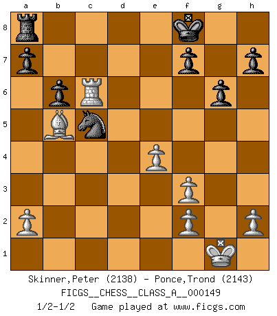 Last move : 1/2-1/2 2014 May 14 20:22:20 [Event "FICGS__CHESS__CLASS_A__000149"] [Site "FICGS"] [Date "2014.02.06"] [Round "1"] [White "Skinner,Peter"] [Black "Ponce,Trond"] [Result "1/2-1/2"] [WhiteElo "2138"] [BlackElo "2143"] 1.d4 d5 2.c4 Nf6 3.cxd5 g6 4.Qa4+ c6 5.Nc3 Nxd5 6.e4 Nxc3 7.bxc3 Bg7 8.Nf3 O-O 9.Bg5 c5 10.Bb5 Bg4 11.O-O cxd4 12.cxd4 Bxf3 13.gxf3 Qxd4 14.Bxe7 Qxa4 15.Bxa4 Bxa1 16.Bxf8 Kxf8 17.Rxa1 Na6 18.Rc1 b6 19.Rc6 Nc5 20.Bb5 1/2-1/2 QGD : Marshall defense Kingside Castling by player Black (move 8) Kingside Castling by player White (move 11) This chess game ended in a draw. Follow this game move after move (download)Spassky will not be psyched out by Fischer. (Mike Goodall) Ein Springer auf f6 gegen die eigene Rochadestellung ist schlimmer als ein rostiger Nagel im Knie. (Efim Bogoljubov) El Ajedrez es de 30 a 40 por ciento psicología. Uno no cuenta con esto cuando se juega contra una computadora. No lo puedo confundir. (Judith Polgar) Les échecs, c'est l'imagination. (David Bronstein) Home computers are being called upon to perform many new functions, including the consumption of homework formerly eaten by the dog. (Doug Larson)