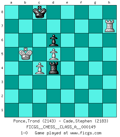 Last move : 1-0 2014 April 28 17:10:47 [Event "FICGS__CHESS__CLASS_A__000149"] [Site "FICGS"] [Date "2014.02.06"] [Round "1"] [White "Ponce,Trond"] [Black "Cade,Stephen"] [Result "1-0"] [WhiteElo "2143"] [BlackElo "2183"] 1.e4 c5 2.Nc3 a6 3.Nge2 Nf6 4.g3 b5 5.Bg2 Bb7 6.Nd5 Nxd5 7.exd5 d6 8.O-O g6 9.d4 c4 10.a4 Bg7 11.Bg5 Nd7 12.axb5 axb5 13.Rxa8 Bxa8 14.Qd2 O-O 15.Ra1 Nf6 16.Ra7 Re8 17.Bxf6 Bxf6 18.Qa5 Qxa5 19.Rxa5 Rb8 20.f4 Bg7 21.Kf2 h5 22.Ra6 b4 23.Bf3 Kf8 24.Ke3 Ke8 25.h4 Kd8 26.Ng1 Kd7 27.Nh3 Bh6 28.Ra7+ Kd8 29.Ng5 Bxg5 30.hxg5 Bb7 31.f5 Ke8 32.f6 Kd7 33.Be2 exf6 34.gxf6 Re8+ 35.Kf2 Kc8 36.Bxc4 Re4 37.c3 Kb8 38.Ra4 bxc3 39.bxc3 h4 40.Kf3 Re6 41.gxh4 Rxf6+ 42.Kg3 g5 43.hxg5 Rg6 44.Kf4 f6 45.gxf6 Rxf6+ 46.Ke3 Rh6 47.Kd3 Kc7 48.Kc2 Rh5 49.Ra5 Kb6 50.Rb5+ Kc7 51.Kb3 Rh1 52.Kb4 Rb1+ 53.Bb3 Ba6 54.Ra5 Be2 55.Ra3 Bd1 56.c4 Bxb3 57.Rxb3 Rd1 58.Rh3 Rxd4 59.Rh7+ Kd8 60.Kb5 Kc8 61.Re7 Kd8 62.Rb7 Kc8 63.Rh7 1-0 Sicilian : Closed Kingside Castling by player White (move 8) Kingside Castling by player Black (move 14) 10 pieces endgame at move 45 : White KRBPPP , Black KRBP WHITE : King + 1 Rook 1 Bishop 3 Pawns BLACK : King + 1 Rook 1 Bishop 1 Pawn 9 pieces endgame at move 56 : White KRPPP , Black KRBP WHITE : King + 1 Rook 3 Pawns BLACK : King + 1 Rook 1 Bishop 1 Pawn 8 pieces endgame at move 57 : White KRPPP , Black KRP WHITE : King + 1 Rook 3 Pawns BLACK : King + 1 Rook 1 Pawn 7 pieces endgame at move 58 : White KRPP , Black KRP WHITE : King + 1 Rook 2 Pawns BLACK : King + 1 Rook 1 Pawn Player White won this chess game. Follow this game move after move (download)There are two classes of men; those who are content to yield to circumstances and who play whist; those who aim to control circumstances, and who play Chess. (Mortimer Collins) Strategie ist, wie man ein Mädchen auf den Rücksitz bekommt. Taktik ist, was man tut, wenn man dann dort ist. (Anonymous) Una de estas pequeñas movidas modestas pudieran ser mas molestas a tu oponente que la amenaza mas grande. (Siegbert Tarrasch) Les sacrifices démontrent seulement que quelqu'un a gaffé. (Savielly Tartacover) At last I discovered the true beauty of chess. So I proposed to her. (Dinesh De Silva)