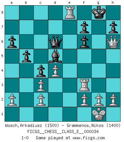Last move : 1-0 2007 April 17 23:2:47 [Event "FICGS__CHESS__CLASS_E__000034"] [Site "FICGS"] [Date "2007.02.12"] [Round "1"] [White "Wosch,Arkadiusz"] [Black "Grammenos,Nikos"] [Result "1-0"] [WhiteElo "1500"] [BlackElo "1400"] 1.e4 e6 2.d4 d5 3.Nc3 c5 4.exd5 exd5 5.Nf3 c4 6.Be2 Nf6 7.O-O Bb4 8.Re1 O-O 9.Bg5 Bxc3 10.bxc3 Be6 11.Ne5 Nbd7 12.Nxd7 Bxd7 13.Bf3 Be6 14.Qd2 b5 15.Re5 Re8 16.Rae1 a6 17.Bxd5 Rb8 18.Bc6 Qd6 19.Bxe8 Rxe8 20.Bxf6 gxf6 21.R5e3 Kf8 22.Rf3 Bd5 23.Qh6+ Kg8 24.Rxe8+ 1-0 French : Marshall variation Kingside Castling by player White (move 7) Kingside Castling by player Black (move 8) Player White won this chess game. Follow this game move after move (download)There are two classes of men; those who are content to yield to circumstances and who play whist; those who aim to control circumstances, and who play Chess. (Mortimer Collins) Ein unbeabsichtigtes Patt ist der Gipfel der Dummheit. (Anonymous) Un buen jugador siempre tiene buena suerte. (José Raúl Capablanca) Ce n'est pas pour s'amuser qu'il joue aux échecs : il célèbre un culte. (Vladimir Nabokov) Life is like internet, nothing interesting, but noone want to leave it. (Ilmars Cirulis)