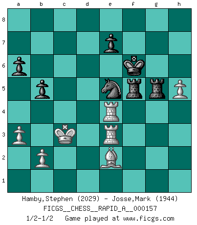 Last move : 1/2-1/2 2014 May 5 20:15:20 [Event "FICGS__CHESS__RAPID_A__000157"] [Site "FICGS"] [Date "2014.02.07"] [Round "1"] [White "Hamby,Stephen"] [Black "Josse,Mark"] [Result "1/2-1/2"] [WhiteElo "2029"] [BlackElo "1944"] 1.d4 Nf6 2.c4 g6 3.Nc3 d5 4.Nf3 Bg7 5.Qb3 dxc4 6.Qxc4 O-O 7.e4 a6 8.Qb3 b5 9.e5 Nfd7 10.Be2 c5 11.e6 cxd4 12.exf7+ Kh8 13.Ne4 Nc6 14.h4 h6 15.h5 g5 16.Bxg5 Nde5 17.Nh4 Rxf7 18.f4 Na5 19.Qg3 Nec4 20.Ng6+ Kg8 21.Ne5 Nxe5 22.fxe5 d3 23.Rd1 Nc4 24.Bxh6 Qb6 25.Bxg7 Rxg7 26.Qxd3 Bb7 27.Qd4 Qxd4 28.Rxd4 Rxg2 29.Rh3 Nxe5 30.Nc5 Bc6 31.Rf4 Bd5 32.Re3 Rg1+ 33.Kf2 Rg2+ 34.Kf1 Rg5 35.Ne4 Bxe4 36.Rfxe4 Rf8+ 37.Ke1 R8f5 38.Kd2 Kg7 39.a3 Kf6 40.Kc3 1/2-1/2 King's Indian defense, 3.Nc3 Kingside Castling by player Black (move 6) This chess game ended in a draw. Follow this game move after move (download)Chess is 99 percent tactics. (Teichmann) Es war undenkbar für die Behörden, dass ein sowjetischer Großmeister auf diese Art und Weise [Fischer-Taimanov 6:0] verliert, ohne dass es eine politischer Erklärung dafür gäbe. (Mark Taimanov) Me gusta decir que Bobby Fischer fue el mejor jugador que jamás haya existido. Pero lo que hizo de Fischer un genio, fue su habilidad de mezclar una frescura y pragmatismo Americano con ideas Rusas acerca de la estrategia. (Bruce Pandolfini) Le jeu d'échecs fait naître et fortifie en nous plusieurs qualités précieuses dans le cours de l'existence, telles que la prévoyance, la circonspection, la prudence, et la persévérance. (Benjamin Franklin - 1783, la morale des échecs) Ah, beer! The cause of, and the solution to, all of life's problems. (Homer Simpson)