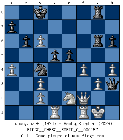 Last move : 0-1 2014 March 26 17:8:39 [Event "FICGS__CHESS__RAPID_A__000157"] [Site "FICGS"] [Date "2014.02.07"] [Round "1"] [White "Lubas,Jozef"] [Black "Hamby,Stephen"] [Result "0-1"] [WhiteElo "1994"] [BlackElo "2029"] 1.e4 e6 2.d4 d5 3.Nc3 Nf6 4.Bg5 Bb4 5.e5 h6 6.Bd2 Bxc3 7.bxc3 Ne4 8.Qg4 g6 9.Qf4 c5 10.Bd3 g5 11.Qe3 Nxd2 12.Qxd2 Nc6 13.h4 g4 14.Bb5 Bd7 15.Rb1 Na5 16.Bxd7+ Qxd7 17.dxc5 Nc4 18.Qf4 O-O-O 19.Ne2 f6 20.exf6 e5 21.Qg3 Rhf8 22.f3 Rxf6 23.Qxg4 Re6 24.Qg3 Qc6 25.Qf2 Rg6 26.Rd1 Rdg8 27.g3 Qe6 28.a4 Rf6 29.c6 b6 30.O-O Qh3 31.f4 Rfg6 0-1 French : MacCutcheon, Lasker variation Queenside Castling by player Black (move 18) Kingside Castling by player White (move 30) Player Black won this chess game. Follow this game move after move (download)Chess is the art which expresses the science of logic. (Mikhail Botvinnik) Das Spiel gibt uns die Genugtuung, die das Leben uns versagt. (Emanuel Lasker) Las ideas audaces son como las piezas del Ajedrez que avanzan hacia adelante. Ellas pueden ser vencidas, pero también pueden iniciar una partida victoriosa. (Goethe) L'action d'une oeuvre littéraire se déroule sur un champ de bataille. Les masques et les types du drame moderne correspondent aux pièces du jeu d'échecs. L'intrigue correspond aux coups et aux gambits, c'est à dire aux techniques du jeu telles qu'utilisées et interprétées par les joueurs. Les tactiques et les péripéties [mouvements] correspondent aux coups exécutés par l'adversaire. (Viktor Shklovsky) There are three kinds of lies: lies, damned lies and statistics. (Mark Twain)