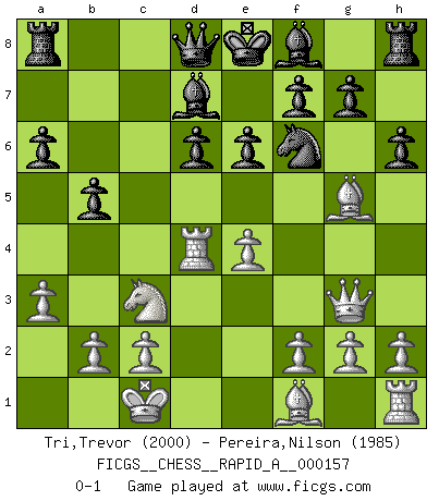 Last move : 0-1 2014 April 7 19:23:9 [Event "FICGS__CHESS__RAPID_A__000157"] [Site "FICGS"] [Date "2014.02.07"] [Round "1"] [White "Tri,Trevor"] [Black "Pereira,Nilson"] [Result "0-1"] [WhiteElo "2000"] [BlackElo "1985"] 1.e4 c5 2.Nf3 d6 3.d4 cxd4 4.Nxd4 Nf6 5.Nc3 a6 6.Bg5 e6 7.Qf3 Bd7 8.O-O-O Nc6 9.Qg3 Nxd4 10.Rxd4 b5 11.a3 h6 0-1 This chess game has been lost on time (started : 2014.02.07 2:25:36) Sicilian : Najdorf, 6...e6 Queenside Castling by player White (move 8) Player Black won this chess game. Follow this game move after move (download)I'm not afraid of Spassky. The world knows I'm the best. You don't need a match to prove it. (Bobby Fischer) Ich weiss nicht was Gott gegen mich auf 1.e4 antworten würde. (Robert James Fischer) Después de una mala apertura, hay una esperanza en el juego medio. Pero una vez que estas en finales, el momento de la verdad ha llegado. (Edmar Mednis) La vie et les Echecs sont tous les deux une lutte constante. (Lasker) Men should grow up. - Yeah. And dogs should stop licking themselves. It's not gonna happen. (Gregory House to Dr. Cameron, House M.D.)
