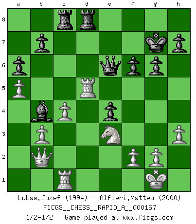 Last move : 1/2-1/2 2014 May 13 19:29:13 [Event "FICGS__CHESS__RAPID_A__000157"] [Site "FICGS"] [Date "2014.02.07"] [Round "1"] [White "Lubas,Jozef"] [Black "Alfieri,Matteo"] [Result "1/2-1/2"] [WhiteElo "1994"] [BlackElo "2000"] 1.e4 e6 2.d4 c5 3.Nf3 cxd4 4.Nxd4 a6 5.Bd3 d5 6.exd5 Qxd5 7.O-O Nd7 8.Be2 Ngf6 9.Nc3 Qd6 10.Be3 Qc7 11.Qd2 Bc5 12.Rfd1 O-O 13.Nb3 Be7 14.Bf4 e5 15.Bg3 Re8 16.Bf3 Nb6 17.Qd3 Nc4 18.Rab1 Bb4 19.Ne4 Nxe4 20.Bxe4 g6 21.c3 Bf8 22.Qe2 Bg7 23.h3 Rb8 24.a4 Nd6 25.Bd5 Bd7 26.Ra1 Bc6 27.Nc5 Nf5 28.Ne4 Nxg3 29.Nxg3 e4 30.Bxc6 Qxc6 31.Nf1 Bf6 32.Ne3 Red8 33.a5 Kg7 34.Ng4 Be7 35.c4 Bc5 36.Rac1 Rbc8 37.b3 Qe6 38.Ne3 Bb4 39.Qb2+ f6 40.Rd5 1/2-1/2 French defense Kingside Castling by player White (move 7) Kingside Castling by player Black (move 12) This chess game ended in a draw. Follow this game move after move (download)Only the player with the initiative has the right to attack. (Wilhelm Steinitz) Mit sehr nachdenklichem Gesicht schreitet Bobby durch den Turniersaal. Was ist passiert?, fragt Lombardy. Ich stehe schlecht, antwortet Fischer. Lombardy: Dann biete doch einfach Remis an. Fischer: So schlecht stehe ich nun auch wieder nicht! (Robert James Fischer) La táctica fluye a partir de una posición superior. (Bobby Fischer) Celui qui prend des risques peut perdre, celui qui n'en prend pas perd toujours. (Xavier Tartacover) If you work for a living, why do you kill yourself working ? (Tuco to a chicken in The Good, The Bad and The Ugly)