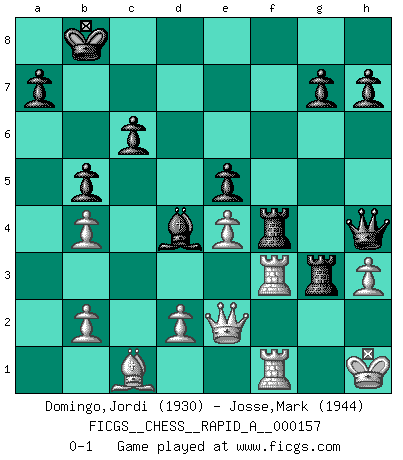 Last move : 0-1 2014 May 14 0:6:46 [Event "FICGS__CHESS__RAPID_A__000157"] [Site "FICGS"] [Date "2014.02.07"] [Round "1"] [White "Domingo,Jordi"] [Black "Josse,Mark"] [Result "0-1"] [WhiteElo "1930"] [BlackElo "1944"] 1.g4 e5 2.c4 d5 3.cxd5 Qxd5 4.Nf3 Bxg4 5.Nc3 Qa5 6.Bg2 Nc6 7.Ng5 Bh5 8.Qb3 Qb6 9.Qc4 Nge7 10.Bf3 Bg6 11.Nd5 Nxd5 12.Bxd5 O-O-O 13.Nxf7 Bxf7 14.Bxf7 Kb8 15.Bd5 Bc5 16.O-O Na5 17.Qe4 Qd6 18.Bf7 Qe7 19.Bb3 Rd4 20.Qg2 Qd7 21.h3 Nxb3 22.axb3 Rd6 23.Ra4 Bd4 24.Kh2 b5 25.Ra5 Rg6 26.Qf3 c6 27.b4 Qd6 28.e4 Rf8 29.Qe2 Qf6 30.Ra3 Qf4+ 31.Kh1 Qh4 32.f4 Rxf4 33.Raf3 Rg3 0-1 Grob's attack Queenside Castling by player Black (move 12) Kingside Castling by player White (move 16) Player Black won this chess game. Follow this game move after move (download)Examine moves that smite! A good eye for smites is far more important than a knowledge of strategical principles. (Purdy) Es tut gut, die Entwicklungsperiode von, [...] demokratischem Geist durchdringen zu lassen. Wie undemokratisch wäre es doch beispielsweise, den einen Offizier große Spaziertouren vornehmen zu lassen, während die anderen zu Hause säßen und sich entsetzlich langweilten. (Aaron Nimzowitsch) Dejen al perfeccionista jugar por correo. (Yasser Seirawan) On entre au jeu d'Echecs comme on entre en Religion. Pour le joueur d'Echecs, la partie d'Echecs c'est l'office, la messe, le défilé du 1er Mai, le dépôt de gerbe au Monument aux Morts. C'est un drame sacré. (Michel Roos) To err is human, to shift the blame on someone else is tactical. (Mladen Jankovic)