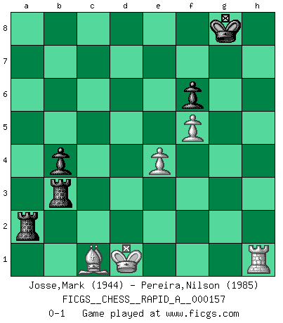 Last move : 0-1 2014 May 18 21:57:57 [Event "FICGS__CHESS__RAPID_A__000157"] [Site "FICGS"] [Date "2014.02.07"] [Round "1"] [White "Josse,Mark"] [Black "Pereira,Nilson"] [Result "0-1"] [WhiteElo "1944"] [BlackElo "1985"] 1.e4 c5 2.Nf3 d6 3.d4 cxd4 4.Nxd4 Nf6 5.Nc3 a6 6.Be3 e5 7.Nb3 Be6 8.h3 Be7 9.Qf3 Nbd7 10.g4 h6 11.O-O-O Rc8 12.Nd5 Nf8 13.Kb1 Ng6 14.c3 b5 15.h4 Nxg4 16.Bb6 Qd7 17.h5 Nf8 18.Bh3 Nh7 19.Qg3 Ng5 20.Nxe7 Kxe7 21.f3 Qb7 22.Ba5 Ne3 23.Bxe6 Nxe6 24.Bb4 Nxd1 25.Rxd1 Rhd8 26.Qxe5 Kf8 27.Bxd6+ Kg8 28.Nd4 Nxd4 29.cxd4 f6 30.Qe6+ Qf7 31.Qf5 Qd7 32.Qxd7 Rxd7 33.Bg3 Kf7 34.d5 b4 35.Rd3 Rb7 36.b3 g5 37.hxg6+ Kxg6 38.Rd2 Rg7 39.f4 h5 40.Bh4 Rd7 41.Bf2 a5 42.Rd1 Re8 43.Rd4 Rde7 44.d6 Rd7 45.Kc2 Kf7 46.f5 Rc8+ 47.Kd2 Rc6 48.Bg3 h4 49.Bf4 Rd8 50.Rd5 Rc3 51.Rxa5 Rf3 52.Ra7+ Kg8 53.Bh6 h3 54.Rg7+ Kh8 55.Rg4 Rxd6+ 56.Ke2 Rc3 57.Rh4 Kg8 58.Be3 Rc2+ 59.Ke1 Ra6 60.Rxh3 R6xa2 61.Kd1 Rg2 62.Rh1 Rg3 63.Bc1 Rxb3 0-1 Sicilian : Najdorf, Byrne (English) attack Queenside Castling by player White (move 11) 10 pieces endgame at move 63 : White KRBPP , Black KRRPP WHITE : King + 1 Rook 1 Bishop 2 Pawns BLACK : King + 2 Rooks 2 Pawns Player Black won this chess game. Follow this game move after move (download)On the chessboard, lies and hypocrisy do not survive long. (Emanuel Lasker) Mein Name ist Rustam Kamsky. Sie haben meinen Sohn belästigt. Bereiten Sie sich aufs Sterben vor. (Rustam Kamsky) A la fecha, Fischer esta simplemente un nivel arriba de todos los mejores jugadores de Ajedrez del mundo. (John Jacobs) À la honte des hommes, on sait que les lois du jeu sont les seules qui soient partout justes, claires, inviolables et exécutées. Pourquoi l'Indien qui a donné les règles du jeu d'échecs est-il obéi de bon gré dans toute la terre, et que les décrétales des papes, par exemple, sont aujourd'hui un objet d'horreur et de mépris ? C'est que l'inventeur des échecs combina tout avec justesse pour la satisfaction des joueurs, et que les papes, dans leurs décrétales, n'eurent en vue que leur seul avantage. L'Indien voulut exercer également l'esprit des hommes et leur donner du plaisir; les papes ont voulu abrutir l'esprit des hommes. Voltaire (Dictionnaire philosophique / Garnier 1967) Somehow our devils are never quite what we expect when we meet them face to face. (Nelson DeMille)