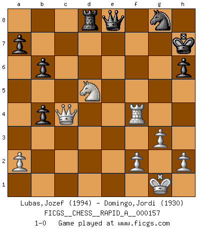 Last move : 1-0 2014 May 28 22:10:25 [Event "FICGS__CHESS__RAPID_A__000157"] [Site "FICGS"] [Date "2014.02.07"] [Round "1"] [White "Lubas,Jozef"] [Black "Domingo,Jordi"] [Result "1-0"] [WhiteElo "1994"] [BlackElo "1930"] 1.e4 e5 2.Nf3 f5 3.exf5 e4 4.Ne5 Nf6 5.Be2 Be7 6.Bh5+ Kf8 7.d4 exd3 8.Nxd3 d5 9.O-O Bxf5 10.Re1 Nc6 11.Bg5 g6 12.Bf3 h6 13.Bxf6 Bxf6 14.Nc3 Ne7 15.Nf4 c6 16.Bg4 Qd6 17.Nxg6+ Bxg6 18.Re6 Qf4 19.g3 Bxc2 20.Qxc2 Qxg4 21.Rxf6+ Kg7 22.Rf4 Qg6 23.Qb3 b6 24.Re1 Rhe8 25.Qb4 Ng8 26.Rxe8 Qxe8 27.Qd4+ Kh7 28.b4 Rd8 29.b5 cxb5 30.Nxd5 b4 31.Qc4 1-0 This chess game has been lost on time (started : 2014.02.07 2:25:36) Latvian counter-gambit Kingside Castling by player White (move 9) Player White won this chess game. Follow this game move after move (download)You need not play well - just help your opponent to play badly. (Genrikh Chepukaitis) Garry Kasparov war erst in der Großmeister-Organisation GMA, dann in der Profischach-Vereinigung PCA, zum Schluss kehrte er wieder in den Schoß der FIDE zurück. Aber gut, manche Leute sind flexibel (Viswanathan Anand) Muchos jugadores de Ajedrez se sorprendían cuando después de la partida, Fischer explicaba con calma: 'Yo ya había analizado esta posibilidad' en una posición en la cual yo creía que no era posible de prever desde la apertura. (Mikhail Tal) Les Echecs, c'est l'art de la guerre sans les charniers, c'est la résurrection des morts tombés au champ d'honneur, l'espoir perpétuel, la suprématie de l'intelligence sur la force, la culture de l'esprit. (F. Szpiner) At last I discovered the true beauty of chess. So I proposed to her. (Dinesh De Silva)