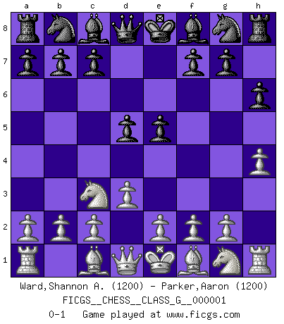 Last move : 0-1 2006 July 5 12:47:57 [Event "FICGS__CHESS__CLASS_G__000001"] [Site "FICGS"] [Date "2006.05.25"] [Round "1"] [White "Ward,Shannon A."] [Black "Parker,Aaron"] [Result "0-1"] [WhiteElo "1200"] [BlackElo "1200"] 1.Nc3 d5 2.d3 e5 3.h4 h6 0-1 This chess game has been lost on time (started : 2006.05.25 14:5:37) Dunst (Sleipner, Heinrichsen) Opening Player Black won this chess game. Follow this game move after move (download)Morphy was probably the greatest genius of them all. (Bobby Fischer) Schach verlangt totale Konzentration. (Robert James Fischer) ¿Se han dado cuenta de que Fischer casi nunca ha tenido piezas malas? El las intercambia y las piezas malas se quedan con sus oponenets. (Yuri Balashov) La vérité est comme le meilleur coup aux échecs : elle existe, mais il faut la chercher. (Arturo Perez-Reverte) Life is the sum of all your choices. (Albert Camus)