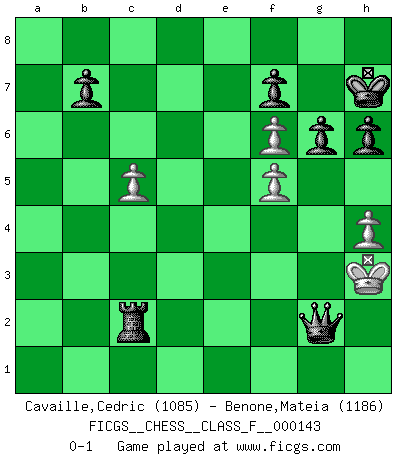 Last move : 0-1 2014 February 18 21:13:50 [Event "FICGS__CHESS__CLASS_F__000143"] [Site "FICGS"] [Date "2014.02.08"] [Round "1"] [White "Cavaille,Cedric"] [Black "Benone,Mateia"] [Result "0-1"] [WhiteElo "1085"] [BlackElo "1186"] 1.e4 e5 2.Nf3 Nf6 3.Nxe5 d6 4.Nf3 Nxe4 5.d3 Nf6 6.Bg5 Be7 7.Be2 O-O 8.O-O h6 9.Bxf6 Bxf6 10.d4 c5 11.dxc5 Bxb2 12.Nc3 Bxc3 13.Qxd6 Bxa1 14.Qxd8 Rxd8 15.Rxa1 Bf5 16.Rd1 Rxd1+ 17.Bxd1 Nc6 18.c3 Rd8 19.Nd4 Nxd4 20.cxd4 Rxd4 21.Be2 Rd2 22.g4 Rxe2 23.gxf5 Rxa2 24.Kg2 a5 25.Kg3 a4 26.h4 a3 27.f4 Rc2 28.Kg4 a2 29.Kh5 Kh7 30.f6 g6+ 31.Kg4 a1Q 32.f5 Qd4+ 33.Kg3 Qf2+ 34.Kh3 Qg2+ 0-1 Petrov : French attack Kingside Castling by player Black (move 7) Kingside Castling by player White (move 8) Promotion Queen by player Black (move 31) Player Black won this chess game. Follow this game move after move (download)Chess is a beautiful mistress. (Bent Larsen) Schachspieler können ausgezeichnet Varianten am Schachbrett berechnen, aber nicht im realen Leben. Zu stark ist der Individualismus im Schach ausgeprägt, und für viele ist ein kleiner momentaner persönlicher Vorteil wichtiger als ein weit größerer Vorteil von morgen. (Anatoly Karpov) Antes de los Finales, los dioses han colocado el Juego Medio. (Siegbert Tarrasch) Fischer est le meilleur joueur du monde et Karpov n'est qu'un joueur de bistrot. (Garry Kasparov, agé de 16 ans) This is where the fun begins. (Anakin Skywalker in Star Wars ep.3)