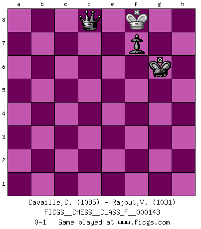 Last move : 0-1 2014 March 18 15:34:19 [Event "FICGS__CHESS__CLASS_F__000143"] [Site "FICGS"] [Date "2014.02.08"] [Round "1"] [White "Cavaille,Cedric"] [Black "Rajput,Vishalsingh"] [Result "0-1"] [WhiteElo "1085"] [BlackElo "1031"] 1.e4 e5 2.Nf3 Nc6 3.d4 exd4 4.Nxd4 Nge7 5.Bb5 a6 6.Bxc6 Nxc6 7.Nxc6 bxc6 8.O-O Be7 9.Nd2 O-O 10.c4 Bb7 11.b3 Bc5 12.Bb2 Qg5 13.Nf3 Qg4 14.Bd4 Bd6 15.Be5 c5 16.Bxd6 cxd6 17.Qxd6 Bxe4 18.Qg3 Bxf3 19.Qxf3 Qxf3 20.gxf3 Rfe8 21.Rfe1 Kf8 22.Rxe8+ Rxe8 23.Kg2 Re2 24.a3 Rb2 25.Rd1 Rxb3 26.Rxd7 Rxa3 27.Ra7 Ra4 28.Kg3 Rxc4 29.Rxa6 Rd4 30.f4 Rd3+ 31.f3 Ke7 32.f5 Rd4 33.Kf2 Rf4 34.Ra7+ Kf6 35.Rc7 Rxf5 36.Ke3 Ke6 37.f4 Kd6 38.Ke4 Rxf4+ 39.Kxf4 Kxc7 40.h4 h6 41.Kf5 Kc6 42.h5 Kd5 43.Kf4 Kd4 44.Kf5 c4 45.Kf4 c3 46.Kf3 Kd3 47.Kf4 c2 48.Ke5 c1Q 49.Kd6 Qa3+ 50.Kd7 Qa7+ 51.Ke8 Kd4 52.Kf8 g6 53.Kg7 gxh5 54.Kxh6 Ke4 55.Kxh5 Kf4 56.Kh6 Qd4 57.Kh7 Kg5 58.Kg8 Kg6 59.Kf8 Qd8+ 0-1 Scotch game Kingside Castling by player White (move 8) Kingside Castling by player Black (move 9) 10 pieces endgame at move 35 : White KRPP , Black KRPPPP WHITE : King + 1 Rook 2 Pawns BLACK : King + 1 Rook 4 Pawns 9 pieces endgame at move 38 : White KRP , Black KRPPPP WHITE : King + 1 Rook 1 Pawn BLACK : King + 1 Rook 4 Pawns 8 pieces endgame at move 39 : White KRP , Black KPPPP WHITE : King + 1 Rook 1 Pawn BLACK : King + 4 Pawns 7 pieces endgame at move 39 : White KP , Black KPPPP WHITE : King + 1 Pawn BLACK : King + 4 Pawns Promotion Queen by player Black (move 48) 6 pieces endgame at move 53 : White K , Black KQPPP WHITE : King + BLACK : King + 1 Queen 3 Pawns 5 pieces endgame at move 54 : White K , Black KQPP WHITE : King + BLACK : King + 1 Queen 2 Pawns 4 pieces endgame at move 55 : White K , Black KQP WHITE : King + BLACK : King + 1 Queen 1 Pawn Player Black won this chess game. Follow this game move after move (download)All I want to do, ever, is just play Chess. (Bobby Fischer) Weshalb minderdergeübte Spieler mit g2-g4 beginnen? Die betreffenden sind unschlüssig, ob sie nun rechts (h4) oder links (f4) beginnen sollen, und in ihrer Ratlosigkeit entschliessen sie sich nach guter Bürgerart dazu, den goldenen Mittelweg zu wählen. (Aaron Nimzowitsch) El Ajedrez es sobre todo, ¡una pelea!. (Emanuel Lasker) Aucun coup ne doit être joué sans but. (Pedro Damiano) However beautiful the strategy, you should occasionally look at the results. (Winston Churchill)
