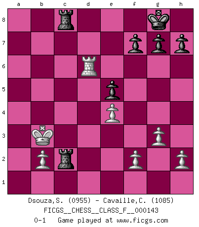 Last move : 0-1 2014 March 7 12:46:52 [Event "FICGS__CHESS__CLASS_F__000143"] [Site "FICGS"] [Date "2014.02.08"] [Round "1"] [White "Dsouza,Stanislaus"] [Black "Cavaille,Cedric"] [Result "0-1"] [WhiteElo "0955"] [BlackElo "1085"] 1.c4 c5 2.Nc3 Nf6 3.d4 cxd4 4.Nd5 e6 5.Nxf6+ Qxf6 6.Nf3 Bb4+ 7.Bd2 Bxd2+ 8.Qxd2 Nc6 9.O-O-O O-O 10.Nxd4 Nxd4 11.Qxd4 Qxd4 12.Rxd4 a6 13.e4 e5 14.Rd6 b5 15.cxb5 axb5 16.Bxb5 Rxa2 17.Bxd7 Ra1+ 18.Kc2 Rxh1 19.Bxc8 Rxc8+ 20.Kb3 Rhc1 21.g3 R1c2 0-1 English : Symmetrical variation Queenside Castling by player White (move 9) Kingside Castling by player Black (move 9) Player Black won this chess game. Follow this game move after move (download)Chess holds its master in its own bonds, shackling the mind and brain so that the inner freedom of the very strongest must suffer. (Albert Einstein) Ein Isolani verdüstert die Stimmung auf dem ganzen Schachbrett. (Savielly Grigorievitsch Tartakower) Una clavada es mas poderosa que una espada. (Fred Reinfeld) Vous n'êtes pas toujours obligé de jouer le meilleur coup. Un coup doit être actif, entreprenant, correct et beau ! (David Bronstein) Either move or be moved. (Ezra Pound)