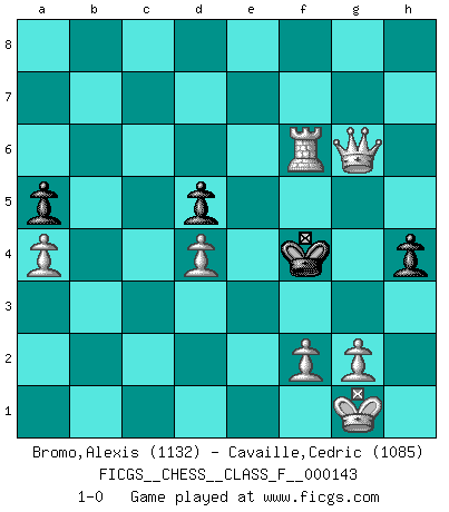 Last move : 1-0 2014 March 4 6:28:51 [Event "FICGS__CHESS__CLASS_F__000143"] [Site "FICGS"] [Date "2014.02.08"] [Round "1"] [White "Bromo,Alexis"] [Black "Cavaille,Cedric"] [Result "1-0"] [WhiteElo "1132"] [BlackElo "1085"] 1.d4 d5 2.c4 dxc4 3.Nc3 e6 4.a3 Qd7 5.e4 b5 6.h3 Nc6 7.Nf3 Nf6 8.e5 Nd5 9.Nxd5 Qxd5 10.Be2 Na5 11.O-O Nb3 12.Rb1 Nxc1 13.Rxc1 Be7 14.Re1 O-O 15.h4 a5 16.Ng5 Bxg5 17.hxg5 Bb7 18.Bf3 Qc5 19.Bxb7 Qa7 20.Bxa8 Qxa8 21.b3 cxb3 22.Qxb3 Qb7 23.Red1 Rd8 24.a4 b4 25.Rc5 Rd5 26.Rxd5 Qxd5 27.Qxd5 exd5 28.Rc1 h6 29.gxh6 gxh6 30.Rxc7 Kg7 31.e6 b3 32.e7 b2 33.Rb7 Kf6 34.e8Q b1Q+ 35.Rxb1 h5 36.Rb6+ Kg5 37.Qxf7 h4 38.Qg6+ Kf4 39.Rf6+ 1-0 Queen's gambit accepted Kingside Castling by player White (move 11) Kingside Castling by player Black (move 14) Promotion Queen by player White (move 34) Promotion Queen by player Black (move 34) Player White won this chess game. Follow this game move after move (download)You cannot play at Chess if you are kind-hearted. (French Proverb) Ein Springer auf f6 gegen die eigene Rochadestellung ist schlimmer als ein rostiger Nagel im Knie. (Efim Bogoljubov) El Ajedrez es una guerra en un tablero. El objetivo es aplastar la mente del oponente. (Bobby Fischer) Que feriez-vous si vous étiez en train de jouer aux échecs et que la fin du monde arrive ? Je continuerais à jouer. (Saint Borromée) May I never be complete. May I never be content. May I never be perfect. Deliver me, Tyler, from being perfect and complete. (Chuck Palahniuk, Fight Club)