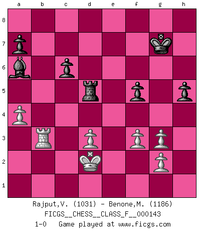 Last move : 1-0 2014 October 10 9:33:10 [Event "FICGS__CHESS__CLASS_F__000143"] [Site "FICGS"] [Date "2014.02.08"] [Round "1"] [White "Rajput,Vishalsingh"] [Black "Benone,Mateia"] [Result "1-0"] [WhiteElo "1031"] [BlackElo "1186"] 1.e4 e5 2.Nf3 Nf6 3.Nxe5 d6 4.Nc4 Nxe4 5.Qf3 Qe7 6.Be2 Nc6 7.O-O d5 8.Ne3 Nd4 9.Qh5 Nf6 10.Bb5+ Nxb5 11.Qh4 Qe4 12.Qg3 Qg6 13.d3 Qxg3 14.hxg3 Nd4 15.Nc3 Be6 16.a4 Bc5 17.Bd2 O-O 18.Rfe1 c6 19.Rab1 Rfe8 20.Ne2 Rad8 21.Nf4 Bc8 22.b4 Bd6 23.Bc3 Ne6 24.Bxf6 gxf6 25.Nh5 Be7 26.Ng4 Rf8 27.b5 Kh8 28.bxc6 bxc6 29.Nhxf6 Bxf6 30.Nxf6 Kg7 31.Ng4 Rfe8 32.f3 Nd4 33.Ne3 h5 34.Kf2 Re7 35.Rb4 Rxe3 36.Rxd4 Rxe1 37.Kxe1 Re8+ 38.Kd2 f5 39.c4 Rd8 40.cxd5 Rxd5 41.Rb4 Ba6 42.Rb3 1-0 This chess game has been lost on time (started : 2014.02.08 9:36:28) Petrov : Paulsen attack Kingside Castling by player White (move 7) Kingside Castling by player Black (move 17) Player White won this chess game. Follow this game move after move (download)Bobby Fischer's current state of mind is indeed a tragedy. One of the world's greatest Chess players - the pride and sorrow of American Chess. (Frank Brady) Fischer machte Schach einfach zu einer aufregenden Sache, wann immer er sich ans Brett setzte. (Raymond Keene) Uno no tiene que jugar muy bien, es suficiente jugar mejor que el oponente. (Siegbert Tarrasch) Les ravages du H expliquent la différence de niveau entre Tal et Thal [Abergel]. Without enthusiasm, virtue functions not at all, and vice only poorly. (Mignon McLaughlin, The Neurotic's Notebook, 1960)