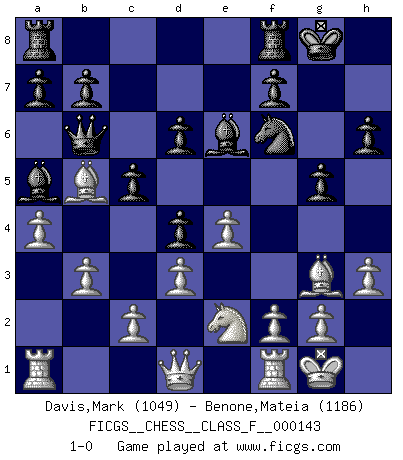 Last move : 1-0 2014 May 29 10:9:29 [Event "FICGS__CHESS__CLASS_F__000143"] [Site "FICGS"] [Date "2014.02.08"] [Round "1"] [White "Davis,Mark"] [Black "Benone,Mateia"] [Result "1-0"] [WhiteElo "1049"] [BlackElo "1186"] 1.e4 e5 2.Nf3 Nf6 3.Nc3 Nc6 4.Bb5 Bb4 5.O-O O-O 6.d3 Nd4 7.Nxd4 exd4 8.Ne2 c5 9.a3 Ba5 10.Bg5 Qb6 11.a4 h6 12.Bh4 g5 13.Bg3 d6 14.h3 Be6 15.b3 1-0 This chess game has been lost on time (started : 2014.02.08 9:36:28) Petrov Three knights game Kingside Castling by player White (move 5) Kingside Castling by player Black (move 5) Player White won this chess game. Follow this game move after move (download)Chess is a foolish expedient for making idle people believe they are doing something very clever when they are only wasting their time. (George Bernard Shaw) Wer wird heute Abend ihr Gegner sein? -- Heute Abend spiele ich gegen die schwarzen Steine. (Akiba Rubinstein) Muchos se han convertido en Maestros de Ajedrez, nadie se ha convertido en el Maestro del Ajedrez. (Siegbert Tarrasch) La vie et les Echecs sont tous les deux une lutte constante. (Lasker) The Internet is the first thing that humanity has build that humanity doesn't understand, the largest experiment in anarchy that we have ever had. (Eric Schmidt)
