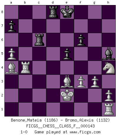 Last move : 1-0 2014 March 5 19:20:7 [Event "FICGS__CHESS__CLASS_F__000143"] [Site "FICGS"] [Date "2014.02.08"] [Round "1"] [White "Benone,Mateia"] [Black "Bromo,Alexis"] [Result "1-0"] [WhiteElo "1186"] [BlackElo "1132"] 1.Nf3 d5 2.d4 Nf6 3.c4 Nc6 4.cxd5 Qxd5 5.Nc3 Qd8 6.d5 Na5 7.e4 e6 8.Qa4+ c6 9.b4 b5 10.Qxa5 Qxa5 11.bxa5 Bb4 12.Bd2 h6 13.dxc6 Bxc3 14.Bxc3 Nxe4 15.Bxg7 Rg8 16.Bxh6 b4 17.g3 f6 18.Rb1 e5 19.Rxb4 Nc3 20.Bc4 Rg6 21.Be3 Bg4 22.Nh4 Rg7 23.f3 Bh5 24.Kd2 Nxa2 25.Bxa2 Rd8+ 26.Ke2 Rc7 27.Bb3 Rxc6 28.Ba4 1-0 Reti Opening Player White won this chess game. Follow this game move after move (download)Via the squares on the chessboard, the Indians explain the movement of time and the age, the higher influences which control the world and the ties which link Chess with the human soul. (Al-Masudi) Charakterschwächen offenbaren sich normalerweise während einer Schachpartie. (Garry Kasparov) El Ajedrez es un expediente tonto que hace creer a la gente inactiva que hacen una cosa muy astuta cuando solamente estan perdiendo su tiempo. (George Bernard Shaw) Donnez-moi un Cavalier en 6e et je gagnerais toutes mes parties. (Steinitz) Big Chess is a place for big hallucinations. (Thibault de Vassal)