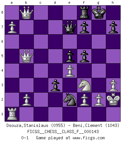 Last move : 0-1 2014 July 29 14:8:10 [Event "FICGS__CHESS__CLASS_F__000143"] [Site "FICGS"] [Date "2014.02.08"] [Round "1"] [White "Dsouza,Stanislaus"] [Black "Beni,Clement"] [Result "0-1"] [WhiteElo "0955"] [BlackElo "1043"] 1.c4 e6 2.a3 Nf6 3.Nc3 Nc6 4.e3 e5 5.d4 d6 6.d5 Ne7 7.Qa4+ Bd7 8.Qc2 Bf5 9.e4 Bd7 10.Bd3 b6 11.Nf3 b5 12.cxb5 Ng4 13.h3 Nf6 14.O-O Ng6 15.Bg5 Be7 16.a4 a6 17.bxa6 c6 18.dxc6 Bxc6 19.Rfc1 d5 20.Bxf6 Bxf6 21.Bb5 Bxb5 22.axb5 d4 23.Nd5 Rc8 24.Qa4 O-O 25.Rxc8 Qxc8 26.Nxf6+ gxf6 27.b6 Nf4 28.b7 Qc7 29.Qb5 d3 30.a7 Ne2+ 31.Kh2 f5 32.b8Q Qe7 0-1 English Opening Kingside Castling by player White (move 14) Kingside Castling by player Black (move 24) Promotion Queen by player White (move 32) Player Black won this chess game. Follow this game move after move (download)It is the aim of the modern school, not to treat every position according to one general law, but according to the principle inherent in the position. (Richard Reti) Ich möchte Schüler heranbilden, die das Vermögen haben, selbst zu denken und Kritik zu üben. (Emanuel Lasker) Repentinamente, me resultaba obvio en mi analisis que yo había pasado por alto lo que Fischer había visto en el tablero con la mas grande facilidad. (Mikhail Botvinnik) Psychologiquement, tu dois avoir confiance en toi même, mais cette confiance doit être basée sur des faits. (Robert Fischer) In every real man a child is hidden that wants to play. (Friedrich Nietzsche)