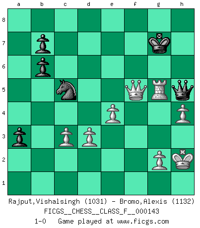 Last move : 1-0 2014 March 9 17:5:16 [Event "FICGS__CHESS__CLASS_F__000143"] [Site "FICGS"] [Date "2014.02.08"] [Round "1"] [White "Rajput,Vishalsingh"] [Black "Bromo,Alexis"] [Result "1-0"] [WhiteElo "1031"] [BlackElo "1132"] 1.e4 e5 2.Nf3 Nc6 3.Bc4 h6 4.O-O Nf6 5.Re1 Bc5 6.a4 a6 7.c3 d6 8.h3 Be6 9.Bxe6 fxe6 10.d3 O-O 11.Be3 Bb6 12.Bxb6 cxb6 13.Qb3 d5 14.Nbd2 Na5 15.Qc2 d4 16.Nxe5 dxc3 17.bxc3 Rc8 18.Ndc4 Nxc4 19.Nxc4 a5 20.Rab1 Nd7 21.Re3 e5 22.Rb5 Re8 23.Nd6 Rc5 24.Rxc5 Nxc5 25.Nxe8 Qxe8 26.Qa2+ Kh7 27.Qd5 Qxa4 28.Qxe5 Qd1+ 29.Kh2 a4 30.Rg3 g5 31.Qf5+ Kg7 32.h4 Qh5 33.f4 a3 34.fxg5 hxg5 35.Rxg5+ 1-0 King's pawn game Kingside Castling by player White (move 4) Kingside Castling by player Black (move 10) Player White won this chess game. Follow this game move after move (download)You sit at the board and suddenly your heart leaps. Your hand trembles to pick up the piece and move it. But what Chess teaches you is that you must sit there calmly and think about whether it's really a good idea and whether there are other better ideas. (Stanley Kubrick) Taktik ist was man tun muß, wenn etwas zu tun ist. Strategie ist was man tun muß, wenn nichts zu tun ist. (Savielly Grigorievitsch Tartakower) No puedes jugar al Ajedrez si eres de corazón noble. (Proverbio Francés) Ce n'est pas pour s'amuser qu'il joue aux échecs : il célèbre un culte. (Vladimir Nabokov) Every now and then a man's mind is stretched by a new idea and never shrinks back to its former dimensions. (Oliver Wendell Holmes, Sr.)