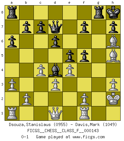 Last move : 0-1 2014 July 10 0:32:7 [Event "FICGS__CHESS__CLASS_F__000143"] [Site "FICGS"] [Date "2014.02.08"] [Round "1"] [White "Dsouza,Stanislaus"] [Black "Davis,Mark"] [Result "0-1"] [WhiteElo "0955"] [BlackElo "1049"] 1.c4 e5 2.Nc3 Nf6 3.e4 Bc5 4.d3 Nc6 5.h3 O-O 6.Bg5 d6 7.Nd5 Be6 8.Nxf6+ gxf6 9.Bh6 Re8 10.Be2 Nd4 11.a3 a6 12.Nf3 Kh8 13.Nxd4 Bxd4 14.O-O Rg8 15.Bh5 Bxh3 16.Kh2 Qd7 17.gxh3 f5 0-1 This chess game has been lost on time (started : 2014.02.08 9:36:28) English Opening Kingside Castling by player Black (move 5) Kingside Castling by player White (move 14) Player Black won this chess game. Follow this game move after move (download)A Chess game is a dialogue, a conversation between a player and his opponent. Each move by the opponent may contain threats or be a blunder, but a player cannot defend against threats or take advantage of blunders if he does not first ask himself: What is my opponent planning after each move ? (Bruce A. Moon) In Buenos Aires ist es nicht mein vorrangiges Ziel ein starkes Turnier zu organisieren, sondern ein Turnier für Gentlemen. Ich würde nie Kamsky einladen. Ich mag keine Probleme. (Miguel Najdorf) Preferería tener un Peón que un dedo. (Reuben Fine) Comme les marins qui ont mille raisons différentes d'aller en mer, les joueurs d'échecs en ont tout autant avant de s'installer devant une table et jouer... (Vincent Bertignac, philosophe) You know what they say : You lie down with the Devil, you wake up in Hell. (Horatio Caine, C.S.I. Miami)