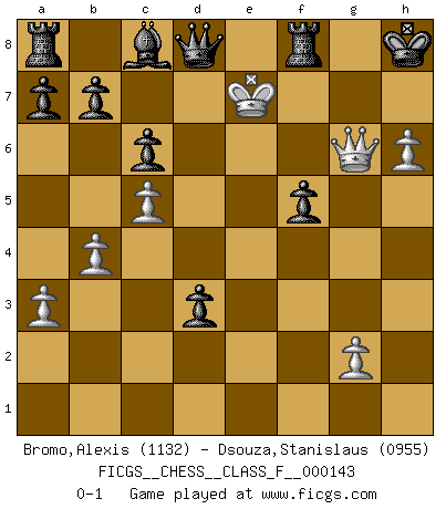 Last move : 0-1 2014 March 15 12:0:2 [Event "FICGS__CHESS__CLASS_F__000143"] [Site "FICGS"] [Date "2014.02.08"] [Round "1"] [White "Bromo,Alexis"] [Black "Dsouza,Stanislaus"] [Result "0-1"] [WhiteElo "1132"] [BlackElo "0955"] 1.d4 Nf6 2.c4 d5 3.Nc3 c6 4.Nf3 e6 5.a3 Bd6 6.c5 Bc7 7.b4 O-O 8.Bg5 h6 9.Bh4 Nbd7 10.e4 dxe4 11.Nxe4 g5 12.Nfxg5 hxg5 13.Nxg5 Bf4 14.Qf3 Bxg5 15.Bxg5 Qc7 16.Bxf6 Nxf6 17.Qxf6 Qd8 18.Qh6 Qd5 19.Bd3 f5 20.Qg6+ Kh8 21.h4 e5 22.h5 Qxd4 23.h6 e4 24.Rh4 Qxa1+ 25.Ke2 Qb2+ 26.Ke3 exd3 27.Rd4 Qe2+ 28.Kf4 Qxf2+ 29.Ke5 Qe3+ 30.Kd6 Qxd4+ 31.Ke7 Qd8+ 0-1 Queen's pawn game Kingside Castling by player Black (move 7) Player Black won this chess game. Follow this game move after move (download)Without error there can be no brilliancy. (Emanuel Lasker) Ich kämpfe solange mein Gegner einen Fehler machen kann. (Emanuel Lasker) El Ajedrez es realmente noventa y nueve por ciento calculación. (Soltis) C'est une question de caractère, Beaucoup de gens perdent leur motivation très vite. D'autres, ils sont rares, peuvent la conserver très longtemps. J'aime les échecs, encore aujourd'hui je suis heureux d'analyser des parties. J'aime toujours gagner, je déteste encore perdre. Bien jouer est important pour mon intégrité intellectuelle et morale. Et puis les échecs vivent en ce moment une période historique grâce à Internet. Ils se développent dans les systèmes éducatifs à travers le monde. Ils sortent de leur ghetto, et c'est mon rôle de mener à bien cette révolution. (Gary Kasparov) True nature is revealed in times of difficulty. (Chinese proverb)