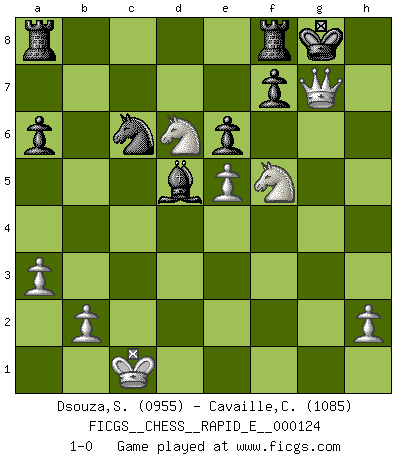 Last move : 1-0 2014 March 18 11:45:51 [Event "FICGS__CHESS__RAPID_E__000124"] [Site "FICGS"] [Date "2014.02.09"] [Round "1"] [White "Dsouza,Stanislaus"] [Black "Cavaille,Cedric"] [Result "1-0"] [WhiteElo "0955"] [BlackElo "1085"] 1.c4 c5 2.Nc3 d6 3.e4 Nf6 4.d4 cxd4 5.Qxd4 e6 6.Bg5 Be7 7.O-O-O a6 8.f4 h6 9.Bh4 O-O 10.Nf3 Nc6 11.Qd3 Nb4 12.Qd2 Bd7 13.a3 Nc6 14.e5 dxe5 15.fxe5 Ne8 16.Bxe7 Qxe7 17.Bd3 Nc7 18.Rhe1 Nd8 19.Qe3 b5 20.Ne4 bxc4 21.Bxc4 Bb5 22.Nd6 Bxc4 23.Qf4 Bd5 24.Nd4 Bxg2 25.Rg1 Bd5 26.Rg3 Nc6 27.Rdg1 g5 28.Rxg5+ hxg5 29.Rxg5+ Qxg5 30.Qxg5+ Kh8 31.Qh6+ Kg8 32.N4f5 Ne8 33.Qg5+ Ng7 34.Qxg7+ 1-0 English : Symmetrical variation Queenside Castling by player White (move 7) Kingside Castling by player Black (move 9) Player White won this chess game. Follow this game move after move (download)I won't play with you anymore. You have insulted my friend. - When an opponent cursed himself for a blunder. (Miguel Najdorf) Als er Schachweltmeister wurde ließ er praktisch alle stärksten Sovietspieler für sich arbeiten. Wenn ein auch nur mittelmässiger Meister ein Spezialist für eine bestimmte Eröffnung war, wurde er von Karpov gerufen. Das wurde alles geheim gehalten. (Mikhail Moiseyevich Botvinik) El Ajedrez es un cuento de Hadas de las 1001 metidas de pata. (Savielly Tartakower) Il s'avisa de me proposer d'apprendre les échecs qu'il jouait un peu... me voilà forcené des échecs. J'achète un échiquier, je m'enferme dans ma chambre, j'y passe des jours et des nuits à vouloir apprendre par cœur toutes les parties. (Jean-Jacques Rousseau, Confessions) Empty your mind, be formless, shapeless — like water. (Bruce Lee)