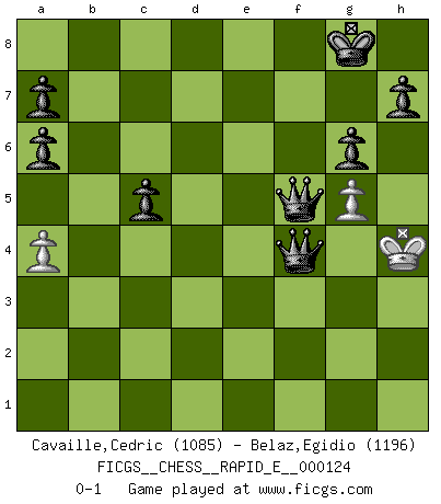 Last move : 0-1 2014 April 8 20:19:35 [Event "FICGS__CHESS__RAPID_E__000124"] [Site "FICGS"] [Date "2014.02.09"] [Round "1"] [White "Cavaille,Cedric"] [Black "Belaz,Egidio"] [Result "0-1"] [WhiteElo "1085"] [BlackElo "1196"] 1.e4 c5 2.Nf3 e6 3.d4 Nc6 4.d5 exd5 5.exd5 Nb4 6.a3 Na6 7.Bxa6 bxa6 8.c4 d6 9.Nc3 Nf6 10.O-O Be7 11.Qc2 O-O 12.Ng5 g6 13.Nge4 Bf5 14.Re1 Ng4 15.h3 Ne5 16.b3 Rb8 17.a4 Nd7 18.Rb1 Nf6 19.g4 Bxe4 20.Nxe4 Nd7 21.Qd2 Ne5 22.Kg2 Nxc4 23.Qh6 Re8 24.Bg5 Ne5 25.Bxe7 Rxe7 26.Ng5 f6 27.Nf3 Nd3 28.Rxe7 Qxe7 29.Qe3 Ne5 30.Nxe5 fxe5 31.Kg3 e4 32.f3 Qe5+ 33.Kf2 Rf8 34.Kg1 Rxf3 35.Qe1 Rxh3 36.Qf2 Rg3+ 37.Kh2 Rf3 38.Kg2 Rxf2+ 39.Kxf2 Qxd5 40.b4 Qd4+ 41.Kg3 Qd3+ 42.Kg2 Qxb1 43.bxc5 dxc5 44.Kf2 Qd3 45.g5 e3+ 46.Kf3 e2 47.Kf4 e1Q 48.Kg4 Qg1+ 49.Kf4 Qg1e3+ 50.Kg4 Qf5+ 51.Kh4 Qe3f4+ 0-1 Sicilian defense Kingside Castling by player White (move 10) Kingside Castling by player Black (move 11) Promotion Queen by player Black (move 47) Player Black won this chess game. Follow this game move after move (download)Chess is mental torture. (Garry Kasparov) Stelle das Brett so, daß die Sonne in die Augen deines Gegners scheint. (Ruy López) Yo siempre he tenido un ligero sentimiento de lástima por una persona que no tiene conocimiento del Ajedrez. (Siegbert Tarrasch) Aux échecs, les retours au sommet sont rares : les dommages psychologiques consécutifs à une défaite sont trop sévères. (Daily Telegraph) The leaves of memory seemed to make a mournful rustling in the dark. (Henry Wadsworth Longfellow)