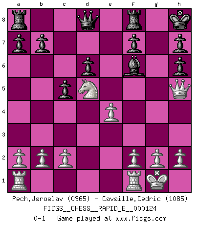 Last move : 0-1 2014 April 19 6:56:35 [Event "FICGS__CHESS__RAPID_E__000124"] [Site "FICGS"] [Date "2014.02.09"] [Round "1"] [White "Pech,Jaroslav"] [Black "Cavaille,Cedric"] [Result "0-1"] [WhiteElo "0965"] [BlackElo "1085"] 1.e4 e5 2.Nf3 d6 3.d4 exd4 4.Nxd4 Nf6 5.Nc3 Bd7 6.Be2 Be7 7.O-O O-O 8.Bf4 Nc6 9.Qd2 Nxd4 10.Qxd4 c5 11.Qe3 Bg4 12.Bxg4 Nxg4 13.Qg3 Nf6 14.Bh6 Nh5 15.Qg4 Bf6 16.Nd5 Kh8 17.Qxh5 gxh6 0-1 Philidor : Exchange variation Kingside Castling by player White (move 7) Kingside Castling by player Black (move 7) Player Black won this chess game. Follow this game move after move (download)I believe that Chess possesses a magic that is also a help in advanced age. A rheumatic knee is forgotten during a game of Chess and other events can seem quite unimportant in comparison with a catastrophe on the chessboard. (Vlastimil Hort) Garry Kasparov war erst in der Großmeister-Organisation GMA, dann in der Profischach-Vereinigung PCA, zum Schluss kehrte er wieder in den Schoß der FIDE zurück. Aber gut, manche Leute sind flexibel (Viswanathan Anand) Repentinamente, me resultaba obvio en mi analisis que yo había pasado por alto lo que Fischer había visto en el tablero con la mas grande facilidad. (Mikhail Botvinnik) RxDa4 pat (...) Yoga is 99% practice and 1% knowledge. (Sri Krishna Pattabhi Jois)