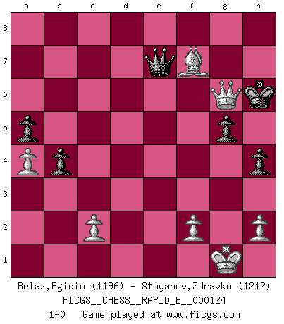 Last move : 1-0 2014 April 25 20:29:51 [Event "FICGS__CHESS__RAPID_E__000124"] [Site "FICGS"] [Date "2014.02.09"] [Round "1"] [White "Belaz,Egidio"] [Black "Stoyanov,Zdravko"] [Result "1-0"] [WhiteElo "1196"] [BlackElo "1212"] 1.e4 c5 2.Bc4 a6 3.Nf3 Nc6 4.Ng5 e6 5.d3 Be7 6.Nf3 h6 7.O-O Nf6 8.Bf4 O-O 9.Re1 e5 10.Nxe5 Nxe5 11.Bxe5 d6 12.Bg3 Qb6 13.Bb3 Re8 14.Na3 Bd7 15.Nc4 Qc7 16.e5 dxe5 17.Bxe5 Qc6 18.Na5 Qb6 19.Nc4 Qc6 20.Bc3 Nd5 21.Ne5 Qd6 22.Nc4 Qg6 23.Ne5 Qd6 24.Qh5 Be6 25.Bd2 Nf6 26.Qd1 Bg4 27.Nxg4 Nxg4 28.Qxg4 b5 29.a4 b4 30.Qf3 Bf6 31.Rxe8+ Rxe8 32.Qg4 Bxb2 33.Rb1 Be5 34.g3 Qf6 35.Be3 Bd6 36.Bc4 a5 37.Bb5 Re6 38.Rd1 Kf8 39.Bc4 Re8 40.Qd7 Rd8 41.Qg4 Be5 42.Bxc5+ Kg8 43.d4 Bc7 44.Re1 g6 45.Re4 h5 46.Qe2 Qc6 47.Bb5 Qf6 48.Be7 Qf5 49.Bxd8 Bxd8 50.Re8+ Kg7 51.Rxd8 Kf6 52.Rg8 Qd5 53.Qc4 Qf3 54.Rf8 Kg7 55.d5 Kxf8 56.d6 Qd1+ 57.Qf1 Qxd6 58.Qe2 Kg7 59.Bc4 Qc5 60.Bb3 f5 61.Qc4 Qe7 62.Qd5 Kh6 63.Qf3 h4 64.g4 fxg4 65.Qxg4 g5 66.Qf5 Kh5 67.Bf7+ Kh6 68.Qg6+ 1-0 Sicilian defense Kingside Castling by player White (move 7) Kingside Castling by player Black (move 8) Player White won this chess game. Follow this game move after move (download)Bobby Fischer is the greatest Chess player who has ever lived. (Ken Smith) Ich würde mich als ganz normalen Jungen bezeichnen [Im Alter von 12]. (Sergej Karjakin) ¿Quién es tu oponente esta tarde? Esta tarde mi oponente son las piezas negras. (Akiba Rubinstein) Les Cavaliers se révèlent fort utiles dans les positions fermées. D'habitude, les Fous sont un peu plus forts que les Cavaliers dans les positions ouvertes. Qu'on le veuille ou non, il restera toujours des exceptions ! Patience, use the Force, think ! (Obi-Wan Kenobi in Star Wars ep.2)