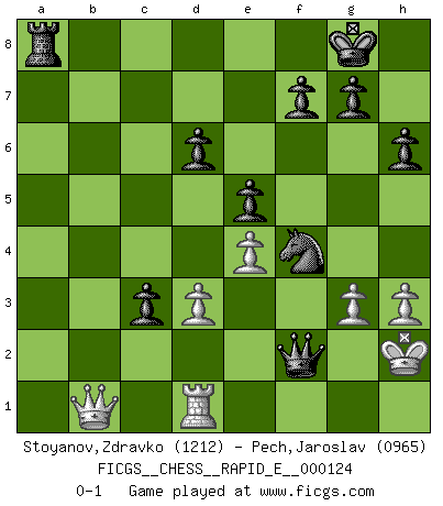 Last move : 0-1 2014 May 11 19:26:5 [Event "FICGS__CHESS__RAPID_E__000124"] [Site "FICGS"] [Date "2014.02.09"] [Round "1"] [White "Stoyanov,Zdravko"] [Black "Pech,Jaroslav"] [Result "0-1"] [WhiteElo "1212"] [BlackElo "0965"] 1.e4 c5 2.Nf3 d6 3.h3 Nf6 4.c3 Nc6 5.d3 e5 6.Bg5 h6 7.Bh4 Be7 8.Nbd2 O-O 9.a3 Be6 10.Bxf6 Bxf6 11.c4 a6 12.Be2 b5 13.b3 Rb8 14.cxb5 axb5 15.O-O Ra8 16.Re1 Qd7 17.a4 bxa4 18.bxa4 Bd8 19.Nc4 Ba5 20.Nxa5 Rxa5 21.Nd2 Rfa8 22.Kh2 Nd4 23.Nc4 Bxc4 24.Bg4 Be6 25.Bxe6 Nxe6 26.Re2 Rxa4 27.Rxa4 Qxa4 28.Qb1 Nf4 29.Rd2 Qb4 30.Rb2 Qd4 31.Rd2 c4 32.g3 c3 33.Rd1 Qxf2+ 0-1 Sicilian Kingside Castling by player Black (move 8) Kingside Castling by player White (move 15) Player Black won this chess game. Follow this game move after move (download)Why must I lose to this idiot ? (Aron Nimzovich) Der Freibauer hat für mich eine Seele, genau wie der Mensch, Wünsche, die unerkannt in ihm schlummern, und Befürchtungen, von deren Existenz er selbst kaum ahnt. (Aaron Nimzowitsch) El Ajedrez es parte de la cultura, y si una cultura esta en decadencia, entonces también el Ajedrez declinará. (Mikhail Botvinnik) Psychologiquement, tu dois avoir confiance en toi même, mais cette confiance doit être basée sur des faits. (Robert Fischer) The intuitive mind is a sacred gift; the rational mind is a faithful servant. We have created a society that honors the servant but has forgotten the gift. (Albert Einstein)