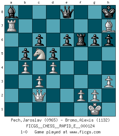 Last move : 1-0 2014 April 28 19:55:43 [Event "FICGS__CHESS__RAPID_E__000124"] [Site "FICGS"] [Date "2014.02.09"] [Round "1"] [White "Pech,Jaroslav"] [Black "Bromo,Alexis"] [Result "1-0"] [WhiteElo "0965"] [BlackElo "1132"] 1.d4 d5 2.Nf3 Nc6 3.Bf4 Nf6 4.e3 a6 5.Bd3 h6 6.h3 b5 7.O-O e6 8.c3 Bd6 9.b4 Ne7 10.Nbd2 O-O 11.a4 Bb7 12.axb5 axb5 13.Qc2 Bxf4 14.exf4 c6 15.Rxa8 Bxa8 16.Ne5 Nd7 17.Nb3 Ng6 18.Bxg6 Nxe5 19.Bh7+ Kh8 20.fxe5 f5 21.exf6 Rxf6 22.Nc5 Qe8 23.Ra1 g6 24.Ra7 1-0 Queen's pawn game, Chigorin variation Kingside Castling by player White (move 7) Kingside Castling by player Black (move 10) Player White won this chess game. Follow this game move after move (download)One of these modest little moves may be more embarrassing to your opponent than the biggest threat. (Siegbert Tarrasch) Die meiste Zeit treffe ich auf Gegner, die meine Enkel sein könnten. Ich bin da, um ihnen zu zeigen, dass sie von mir noch einiges lernen können. (Viktor Kortschnoi) El juego de Damas es para vagabundos. (Paul Morphy) Je crois qu'il existe des manières très spécifiques de jouer efficacement contre une machine. Evidemment, nous n'avons aucune chance en technique pure, parce que l'ordinateur calcule de manière parfaite. Mais lorsque nous faisons appel à notre cerveau, en utilisant l'intuition et la compréhension, alors nous restons beaucoup plus forts. (Anatoli Karpov) 98% of all statistics are made up. (Author unknown)