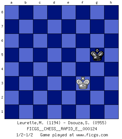 Last move : 1/2-1/2 2014 May 28 12:55:49 [Event "FICGS__CHESS__RAPID_E__000124"] [Site "FICGS"] [Date "2014.02.09"] [Round "1"] [White "Leurette,Marc-Antoine"] [Black "Dsouza,Stanislaus"] [Result "1/2-1/2"] [WhiteElo "1194"] [BlackElo "0955"] 1.e4 c5 2.Nf3 d6 3.d4 Bd7 4.Nc3 Nc6 5.Bb5 cxd4 6.Bxc6 Bxc6 7.Nxd4 Nf6 8.Nxc6 bxc6 9.O-O e5 10.Bg5 Be7 11.Bxf6 Bxf6 12.Qg4 O-O 13.Ne2 Qb6 14.b3 d5 15.Ng3 g6 16.Nh5 Bg7 17.Nxg7 Kxg7 18.g3 Qd4 19.Rfe1 dxe4 20.Qxe4 Qxe4 21.Rxe4 f6 22.c4 Rad8 23.f4 Rd2 24.fxe5 fxe5 25.Rxe5 R8f2 26.Re7+ Kh6 27.h4 Rg2+ 28.Kf1 Rh2 29.Kg1 Rhg2+ 30.Kf1 Rxa2 31.Rxa2 Rxa2 32.c5 Ra3 33.Re3 a5 34.Kf2 a4 35.Re6 Rxb3 36.Rxc6 a3 37.Ra6 Rb2+ 38.Kf3 a2 39.c6 Rc2 40.g4 a1Q 41.Rxa1 Rxc6 42.Re1 Rf6+ 43.Kg3 Ra6 44.g5+ Kh5 45.Re7 h6 46.gxh6 Kxh6 47.Rf7 Ra3+ 48.Kg4 Ra4+ 49.Rf4 Rxf4+ 50.Kxf4 Kh5 51.Kg3 g5 52.hxg5 Kxg5 53.Kf3 1/2-1/2 Sicilian Kingside Castling by player White (move 9) Kingside Castling by player Black (move 12) 10 pieces endgame at move 36 : White KRPPP , Black KRPPP WHITE : King + 1 Rook 3 Pawns BLACK : King + 1 Rook 3 Pawns Promotion Queen by player Black (move 40) 9 pieces endgame at move 41 : White KRPPP , Black KRPP WHITE : King + 1 Rook 3 Pawns BLACK : King + 1 Rook 2 Pawns 8 pieces endgame at move 41 : White KRPP , Black KRPP WHITE : King + 1 Rook 2 Pawns BLACK : King + 1 Rook 2 Pawns 7 pieces endgame at move 46 : White KRPP , Black KRP WHITE : King + 1 Rook 2 Pawns BLACK : King + 1 Rook 1 Pawn 6 pieces endgame at move 46 : White KRP , Black KRP WHITE : King + 1 Rook 1 Pawn BLACK : King + 1 Rook 1 Pawn 5 pieces endgame at move 49 : White KP , Black KRP WHITE : King + 1 Pawn BLACK : King + 1 Rook 1 Pawn 4 pieces endgame at move 50 : White KP , Black KP WHITE : King + 1 Pawn BLACK : King + 1 Pawn 3 pieces endgame at move 52 : White KP , Black K WHITE : King + 1 Pawn BLACK : King + 2 pieces endgame at move 52 : White K , Black K WHITE : King + BLACK : King + This chess game ended in a draw. Follow this game move after move (download)Even the laziest King flees wildly in the face of a double check ! (Aaron Nimzowitsch) Oft bringt ein stiller Zug das Erdbeben. (Richard Reti) Todo se encuentra en un estado de flujo y esto incluye al mundo del Ajedrez. (Mikhail Botvinnik) Soyez une menace à chaque fois que vous vous asseyez pour jouer. (Ken Smith) Life is like a game of cards: the hand you are dealt represents determinism; the way you play it is free will. (Jawaharlal Nehru)
