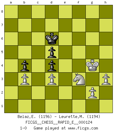 Last move : 1-0 2014 April 20 17:24:26 [Event "FICGS__CHESS__RAPID_E__000124"] [Site "FICGS"] [Date "2014.02.09"] [Round "1"] [White "Belaz,Egidio"] [Black "Leurette,Marc-Antoine"] [Result "1-0"] [WhiteElo "1196"] [BlackElo "1194"] 1.e4 e5 2.Nf3 Nc6 3.Bc4 Nf6 4.Ng5 Bc5 5.Nxf7 Bxf2+ 6.Kxf2 Nxe4+ 7.Kg1 Qh4 8.Qf3 Rf8 9.d3 Ng5 10.Bxg5 Qe1+ 11.Qf1 Qxf1+ 12.Kxf1 d6 13.Ke1 Nd4 14.Kd2 Be6 15.Bxe6 Nxe6 16.Nc3 Rxf7 17.Bh4 g5 18.Bg3 O-O-O 19.Rhf1 Rdf8 20.Rxf7 Rxf7 21.Ne4 h6 22.b3 b5 23.Kc3 a6 24.a3 Kd7 25.a4 Nd4 26.Kd2 Ke6 27.axb5 axb5 28.Nf2 c5 29.Rb1 b4 30.Ra1 h5 31.Ne4 Rf5 32.Rc1 h4 33.Bf2 Kd5 34.Bxd4 exd4 35.Re1 g4 36.Re2 Re5 37.Nf6+ Ke6 38.Rxe5+ Kxe5 39.Nxg4+ Kf4 40.Nf6 Kf5 41.Ne4 Ke5 42.Ke2 Kd5 43.h3 Kc6 44.Kf3 d5 45.Nd2 Kd6 46.Kg4 Ke5 47.Nf3+ Kd6 48.Nxh4 c4 49.Nf3 cxb3 50.cxb3 1-0 Two knights defense : Wilkes Barre (Traxler) variation Queenside Castling by player Black (move 18) 10 pieces endgame at move 50 : White KNPPPP , Black KPPP WHITE : King + 1 Knight 4 Pawns BLACK : King + 3 Pawns Player White won this chess game. Follow this game move after move (download)Up to this point White has been following well-known analysis. But now he makes a fatal error: he begins to use his own head. (Siegbert Tarrasch) Sitze auf Deine Hände. (Siegbert Tarrasch) Cada Peón es una Reina en potencia. (James Mason) Les échecs sont un jeu terrible. Si vous n'avez pas le centre, votre adversaire a une position plus libre. Par contre, si vous avez le centre, alors vous avez vraiment quelque chose pour laquelle vous inquiéter ! (Siegbert Tarrasch) Wikichess, chess moves explained by 'experimented' players. (Thibault de Vassal)