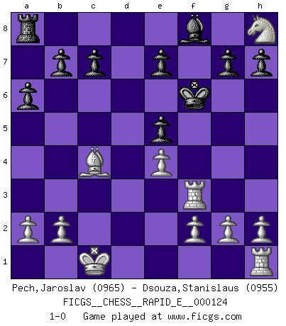 Last move : 1-0 2014 May 16 16:37:11 [Event "FICGS__CHESS__RAPID_E__000124"] [Site "FICGS"] [Date "2014.02.09"] [Round "1"] [White "Pech,Jaroslav"] [Black "Dsouza,Stanislaus"] [Result "1-0"] [WhiteElo "0965"] [BlackElo "0955"] 1.c4 d5 2.cxd5 Qxd5 3.Nc3 Qd8 4.Nf3 Nc6 5.d4 Nf6 6.d5 Nxd5 7.Qxd5 Qxd5 8.Nxd5 Kd8 9.Ng5 f6 10.Nf7+ Kd7 11.Nxh8 Kd6 12.e4 Be6 13.Bf4+ Ne5 14.Bxe5+ fxe5 15.O-O-O Bxd5 16.Rxd5+ Ke6 17.Bc4 Kf6 18.Rd3 a6 19.Rf3+ 1-0 English Opening Queenside Castling by player White (move 15) Player White won this chess game. Follow this game move after move (download)Chess is a matter of delicate judgment, knowing when to punch and how to duck. (Bobby Fischer) Ich erzeugte keinen Neid, da mich die Schachspieler als Musiker und die Musiker als Schachspieler betrachteten. (Mark Taimanov) Nunca antes ha habido un jugador de Ajedrez con tal conocimiento a fondo de las complejidades del juego y una inmensa voluntad absolutamente indomable de ganar. Yo pienso que Fischer es el jugador mas grande que jamás haya existido. (Lisa Lane) Tous ces prétendus hommes politiques sont les pions, les Cavaliers, les Tours ou les Fous d'une partie d'échecs qui se jouera tant qu'un hasard ne renversera pas l'échiquier. (Honoré de Balzac) I just play for fun. (Anna Kournikova)